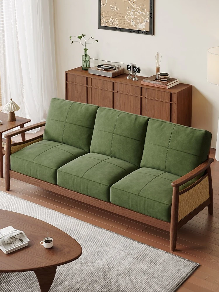 北欧スタイルの冬夏兼用実木ソファ - 小スペースに最適な3人掛け、民宿やシンプルモダンなリビングにぴったりの和風ナチュラルソファ!快適さとデザインを両立した一品です。