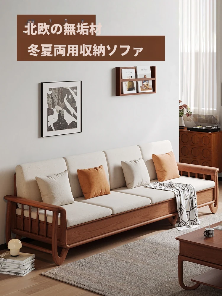 北欧スタイルの実木ソファ|モダンミニマリストデザイン|冬夏両用|ホワイトアッシュ材|新中式&和風の大板|収納機能付きでお部屋をスッキリ!