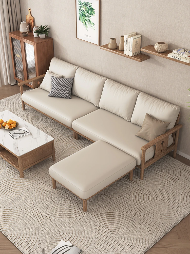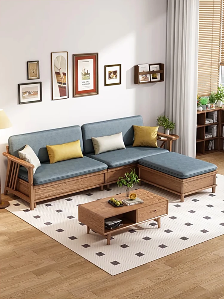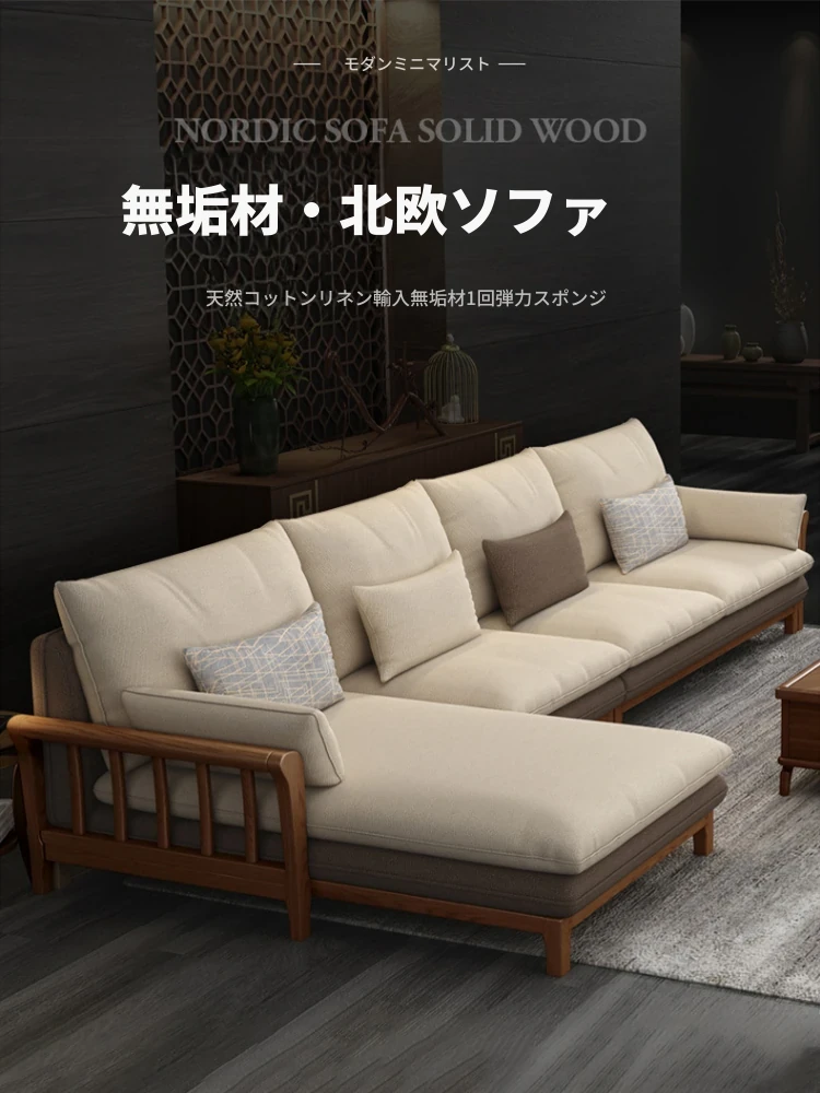 北欧スタイルの無垢材ソファセット|モダンでシンプルな新中式デザイン|小さなリビングにもぴったりのファブリック仕様|ホワイトアッシュ材使用|人気のコーナータイプでおしゃれな空間を演出!