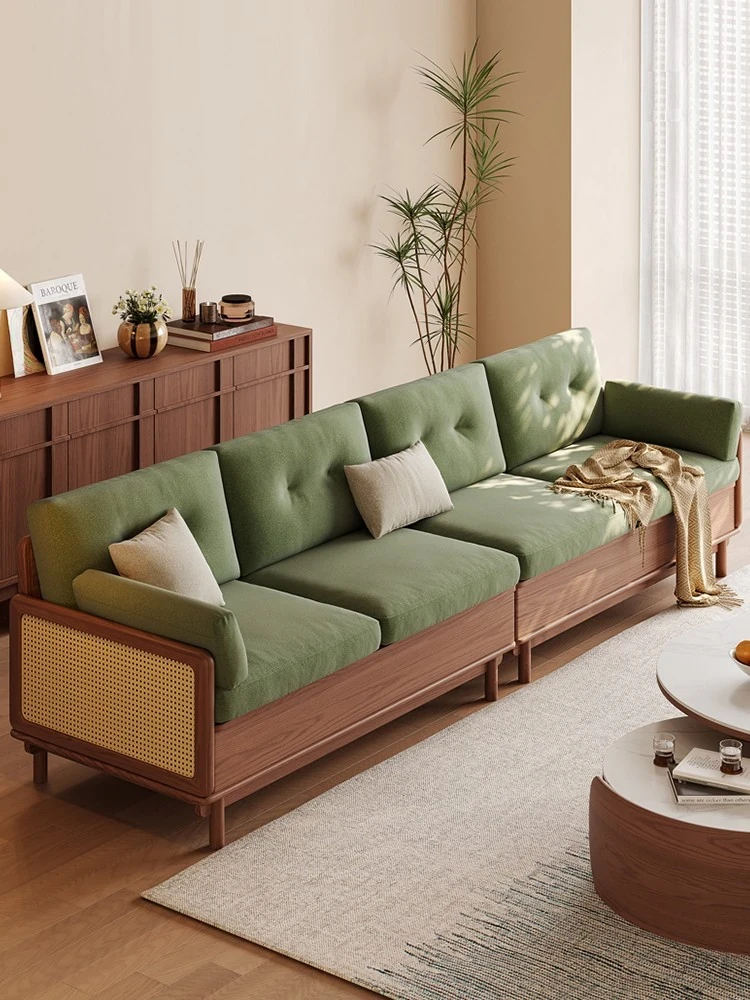 新中式スタイルの無垢材ソファ、白アリ木製、北欧デザインでシンプルな直線的フォルム。4人掛け、ウォールナット色で、冬夏両用の快適なリビングソファ。おしゃれで機能的、どんなインテリアにもぴったり!