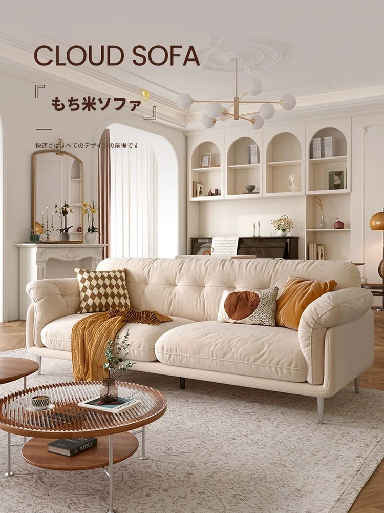 雲のような柔らかさを持つレトロモダンな3人掛けソファ。小さな空間にもぴったり!侘寂の美が漂うクリーム色の軽奢ソファで、心地よいリビングを演出します。科技布使用で耐久性も抜群!