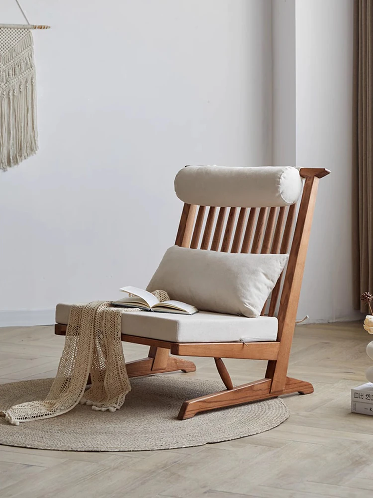 デザイナーの一人掛け椅子、インスタ映えする無垢材のソファチェア。侘び寂び風のスタイルで、バルコニーや和室、リビングルームに最適なリラックスチェア。おしゃれで心地よい空間を演出します!
