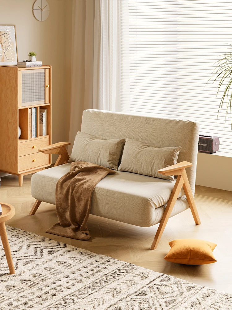 He木屋の和風天然木製ソファベッド - 折りたたみ式・多機能デザイン!最新のテクニカルファブリックを使用した、コンパクトなリビングに最適な新モデル。おしゃれで実用的な小型ソファで、快適なひとときをお楽しみください!