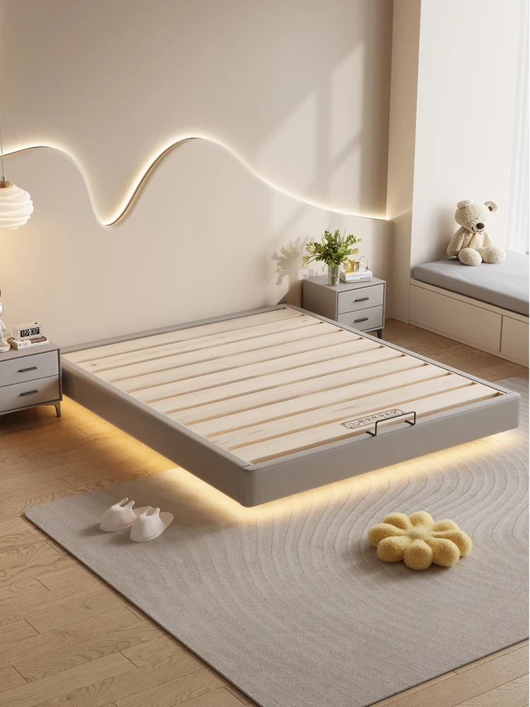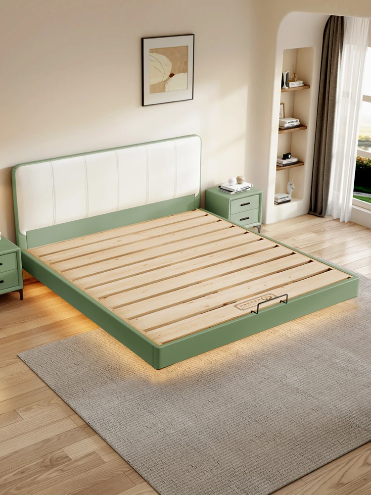 クリーム風の本革クラウドデザイン、インフルエンサー注目のフェアリーベッド!浮遊感のあるダブルベッド、スチールと木材のハイブリッドフレームで、快適な眠りをサポートします!