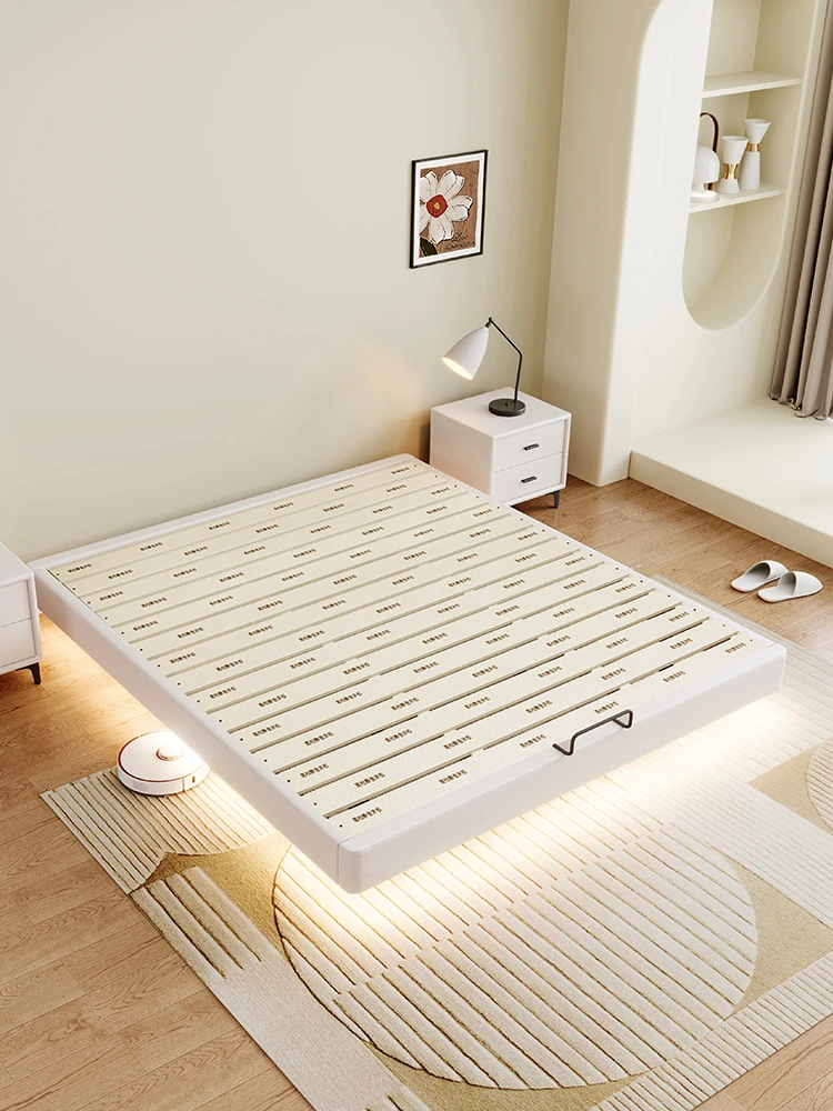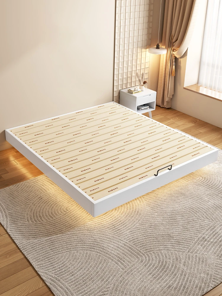 ヘッドレス浮遊ベッドフレーム|静音設計で干渉なし|厚手のモダンスタイル|クリーム風の全木製スラットベッド|快適でおしゃれな眠りを実現!