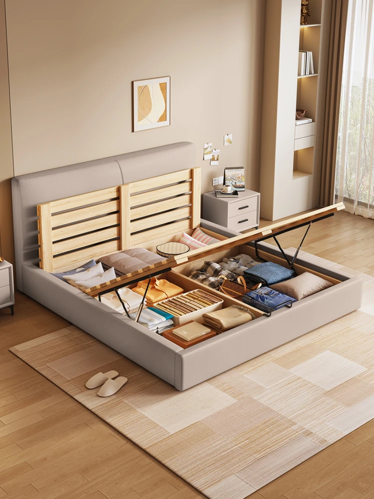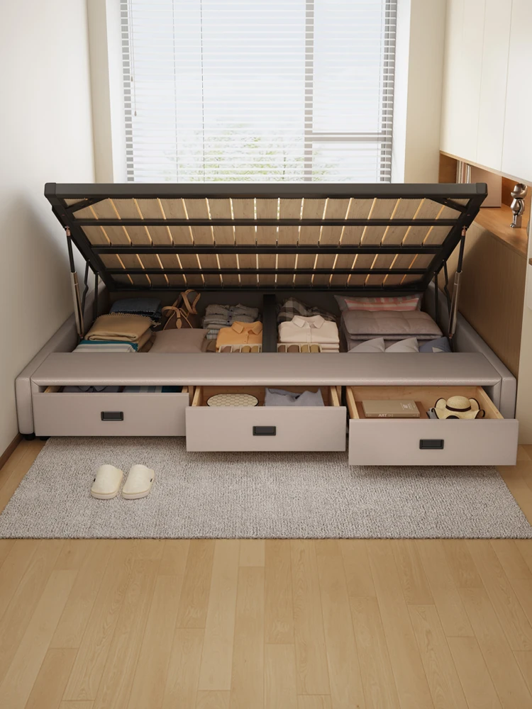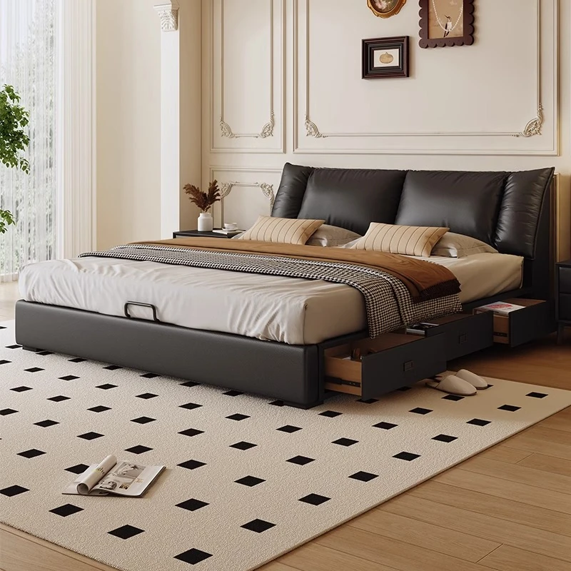 イタリアンミニマリズムの本革ソフトパッキング1.8mダブルベッド - ガス圧収納付き、3つの引き出しと多彩な構造選択可能!おしゃれで機能的な主寝室の必需品。