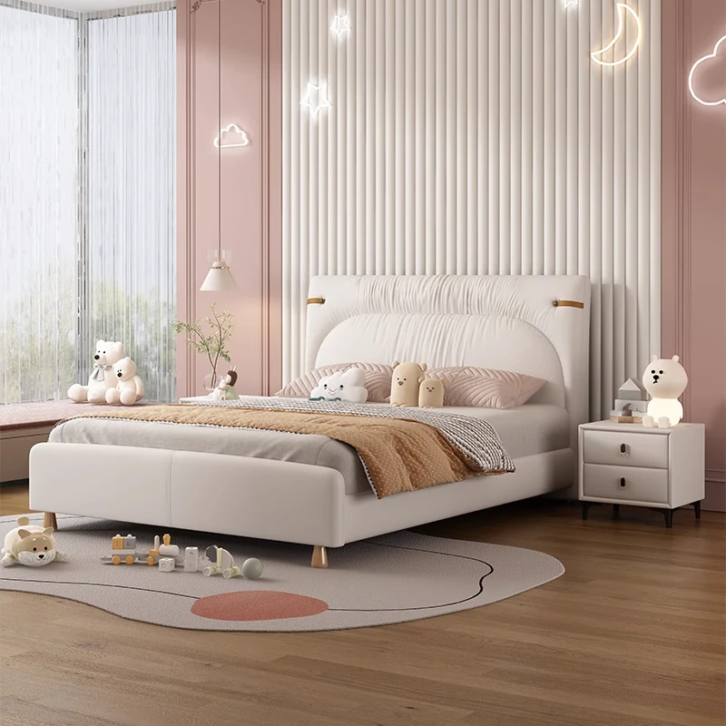 クリーム風の少女と少年のソフトパッケージ子供用プリンセスベッド - シンプルでスタイリッシュな1.2m、1.5m、1.8mのダブル/シングル実木ベッドで、夢のような寝室を演出!