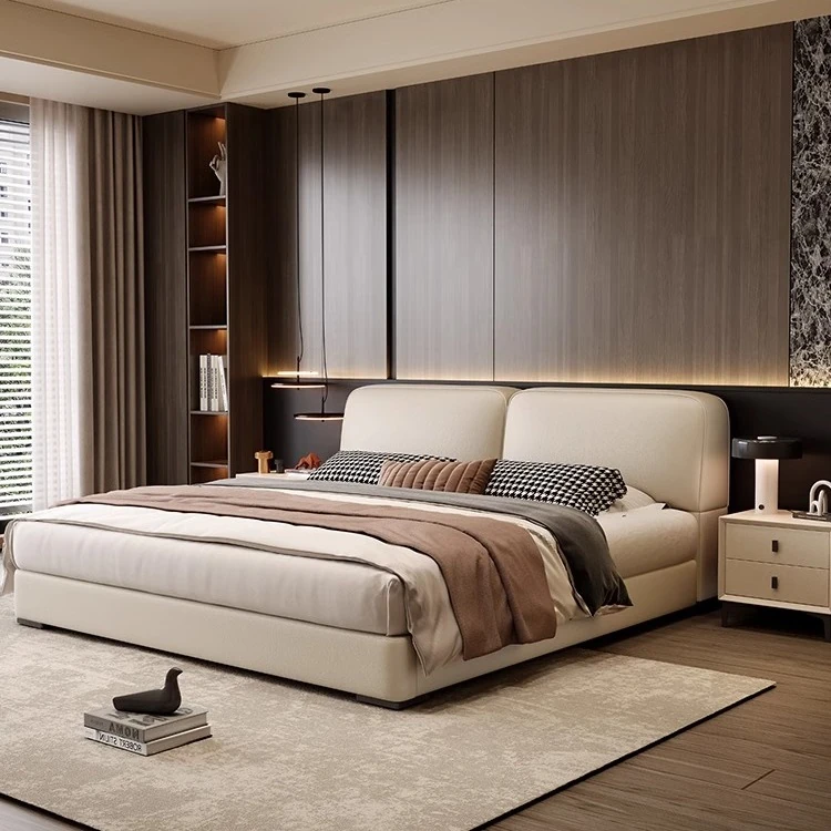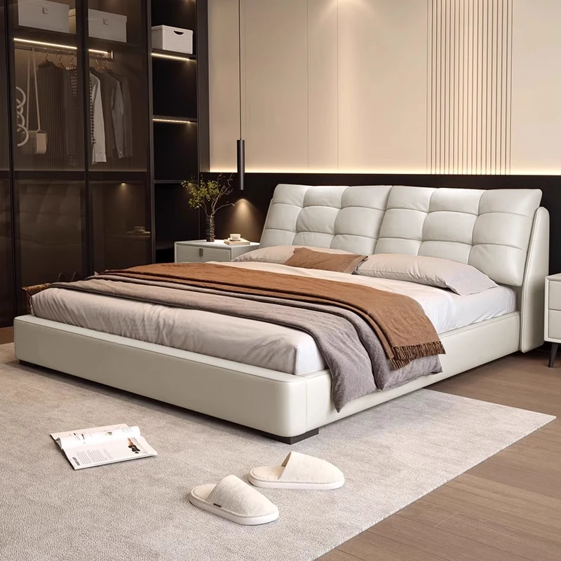 イタリアンスタイルのラグジュアリーソフトパッケージ本革ベッド|高級小型住宅に最適なダブルベッド|静音スチールウッドフレーム|多機能デザインで快適な眠りを実現!