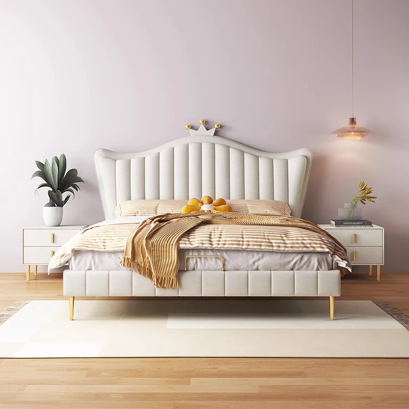 クリーム風の王冠デザインソフトパッキングキッズプリンセスベッド - モダンでシンプルな1.5mサイズ、単身・ダブル対応の天然木製ベッド、小スペースにもぴったり!お子様の夢の空間を演出します。