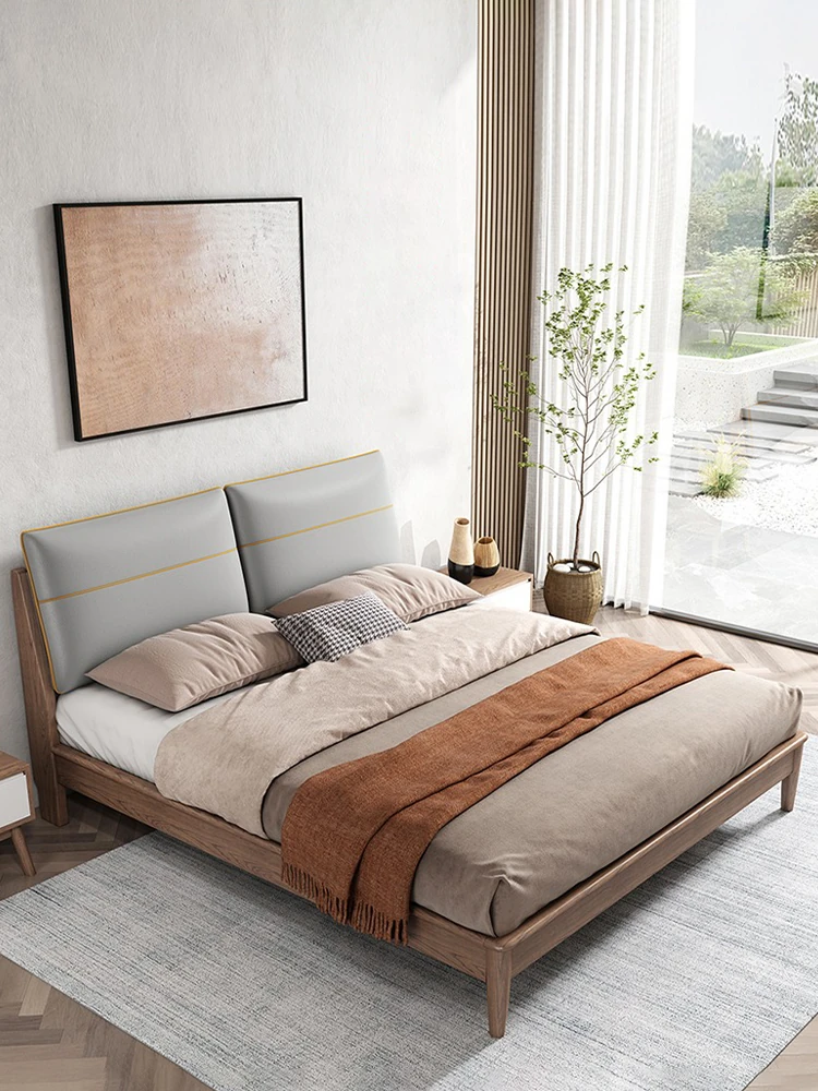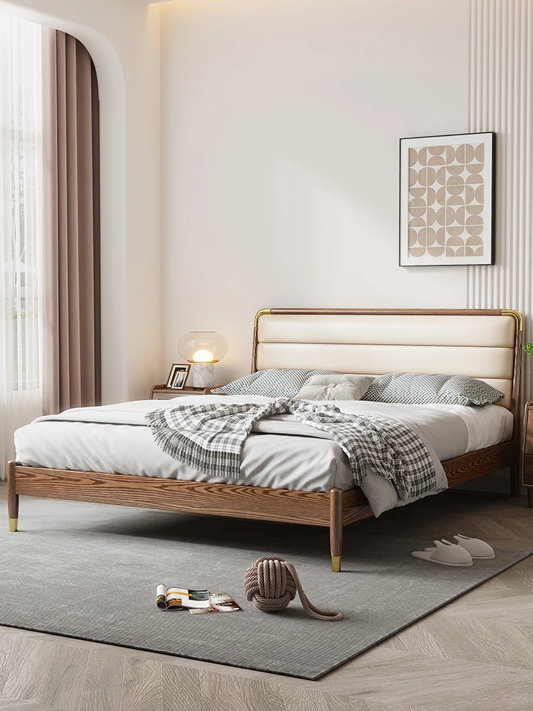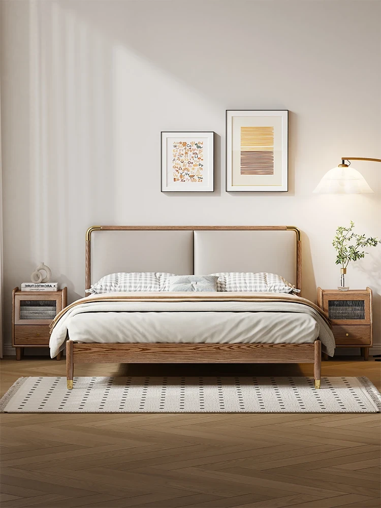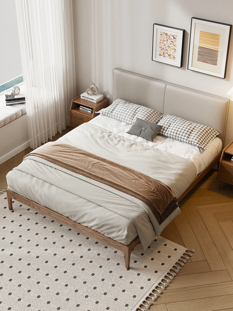 モダンミニマリストデザインの本革製ウッドベッド - 1.5mと1.8mのサイズ展開!北欧ホワイトアッシュのエレガントな仕上げ、快適なソフトパッキングで、理想の主寝室を実現します。おしゃれで機能的なダブルベッド。