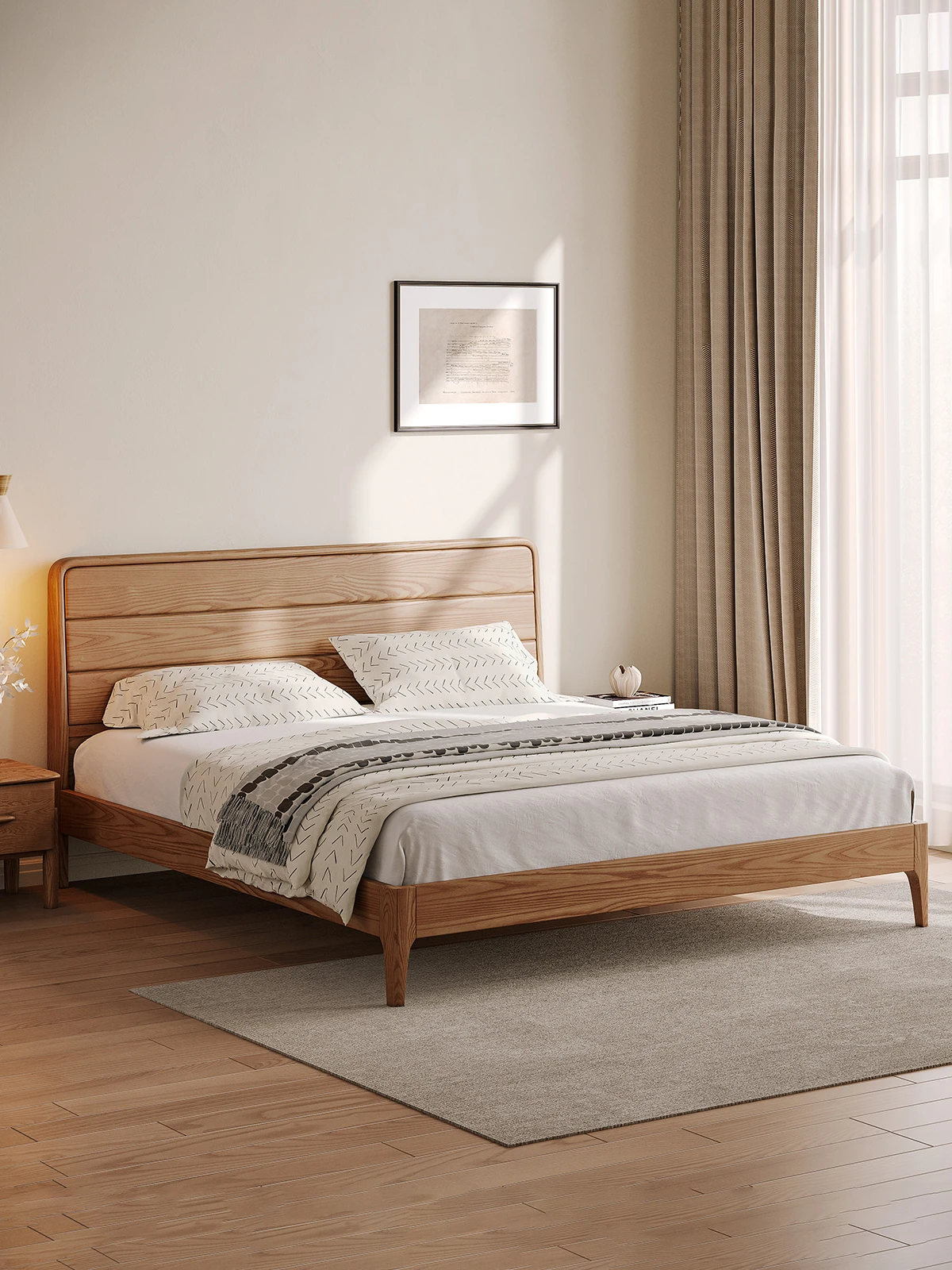 北欧スタイルの全実木ベッド|ホワイトアッシュ材使用|コンパクトな小型住宅に最適|高箱収納付き|シンプルモダンなデザイン|主寝室にぴったりな機能的なダブルベッド