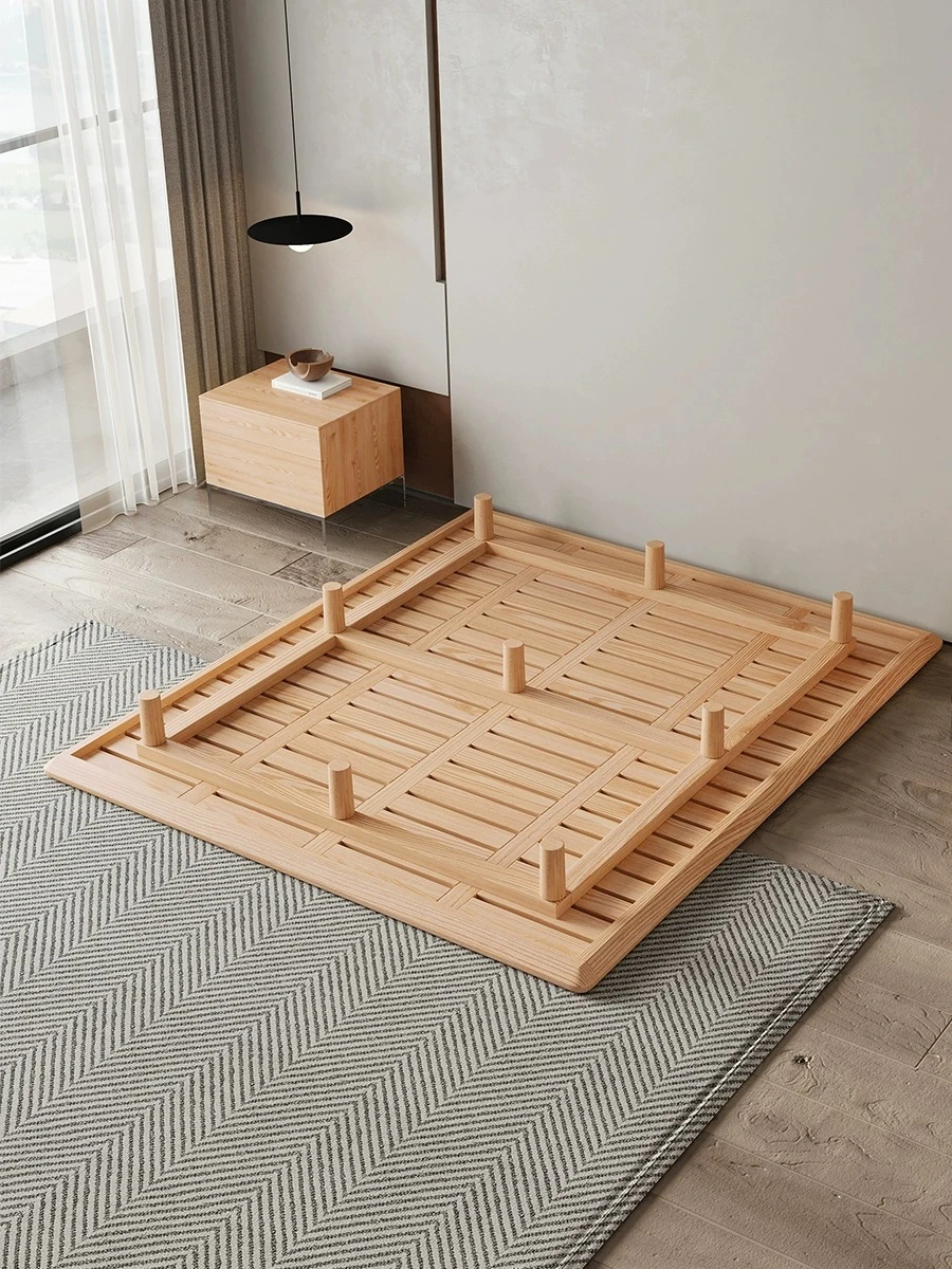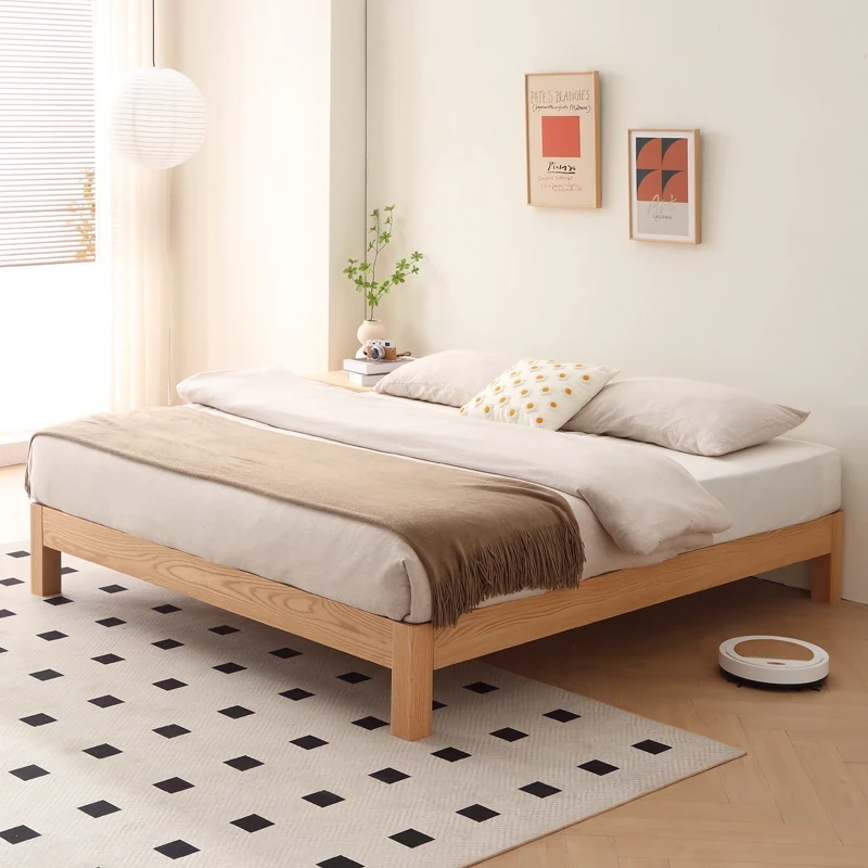 北欧スタイルの和風レッドオーク無頭ボードベッドフレーム - 小さなスペースに最適な畳スタイル、シングル&ダブル対応、ナチュラルウッドの魅力を引き立てる実木ベッド!