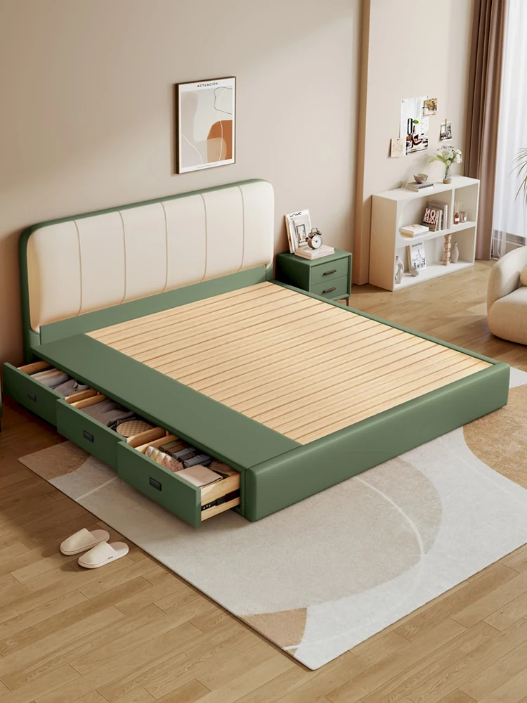 北欧スタイルの本革ソフトパネルベッド、モダンなホワイトアッシュ材使用!1.5mサイズの収納付きシンプルダブルベッド。主寝室や結婚祝いにぴったりの高箱設計で、快適さと機能性を両立!