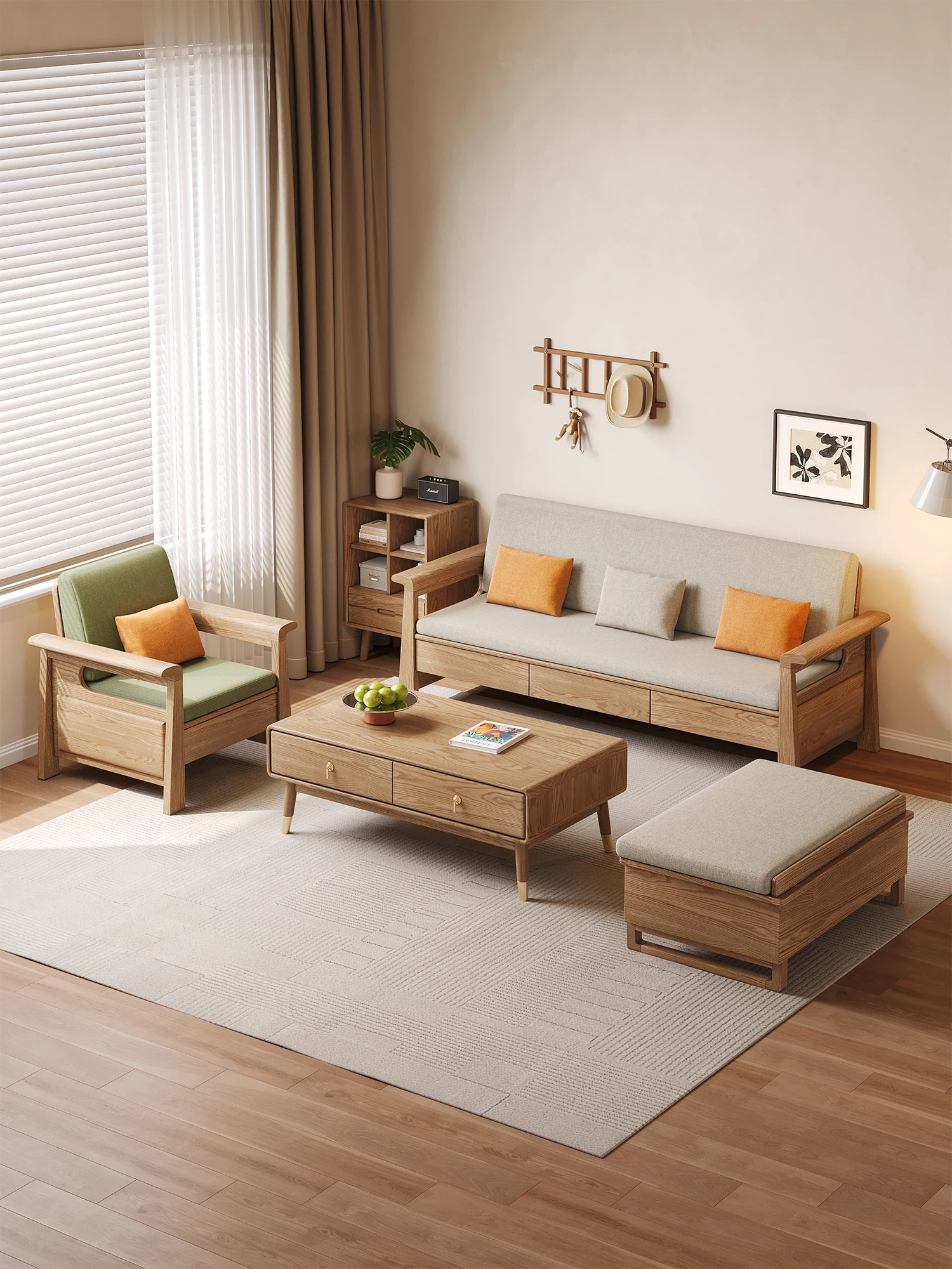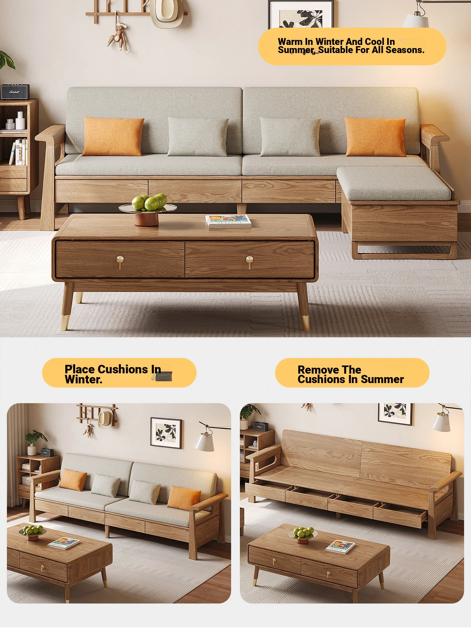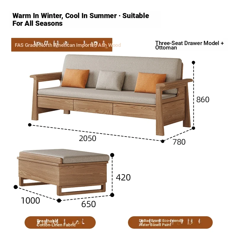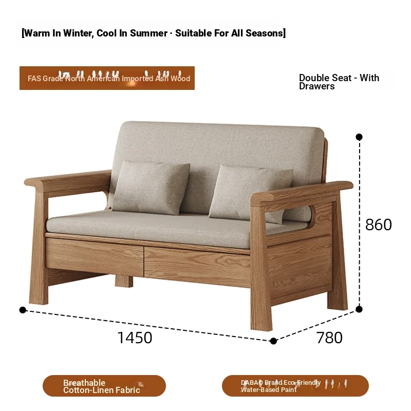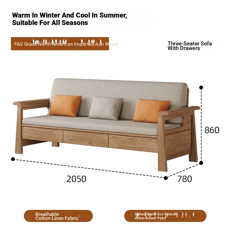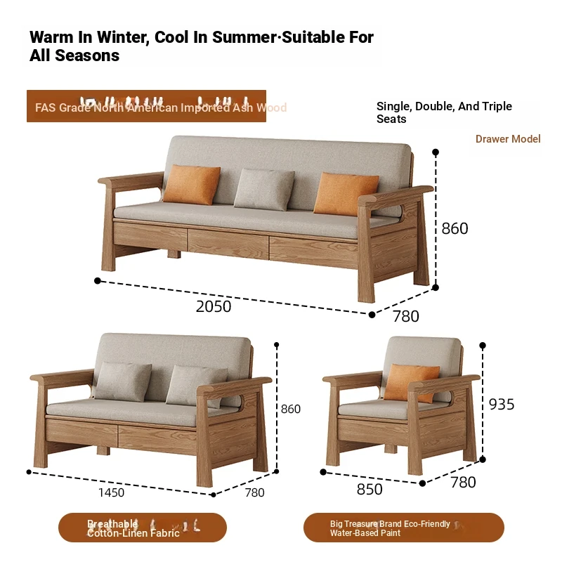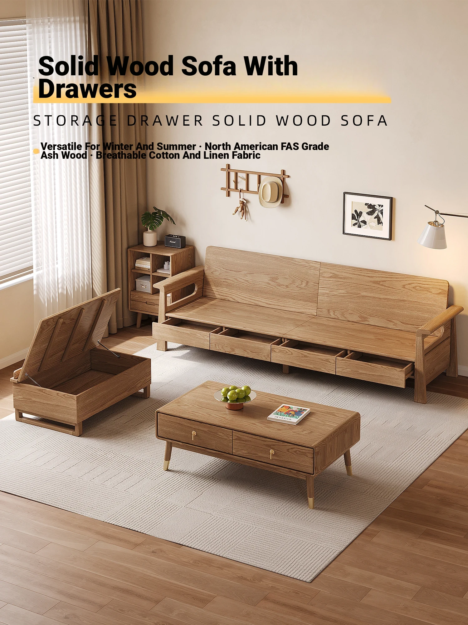 Nordic Solid Wood Sofa Set - Modern Minimalist Design, Versatile for Winter and Summer, Featuring Ash Wood Drawers for Storage, Perfect for Small to Medium Living Spaces