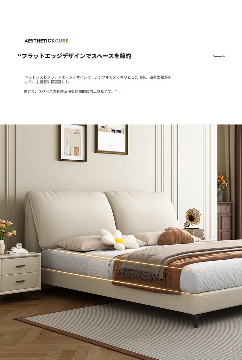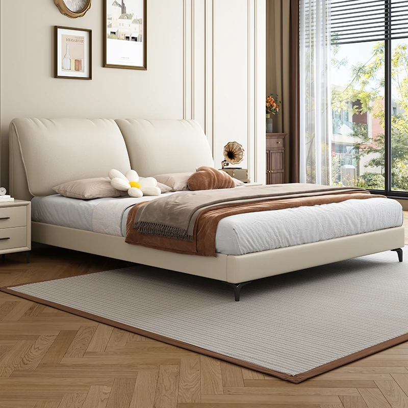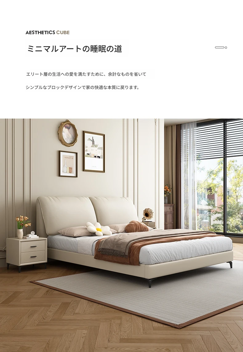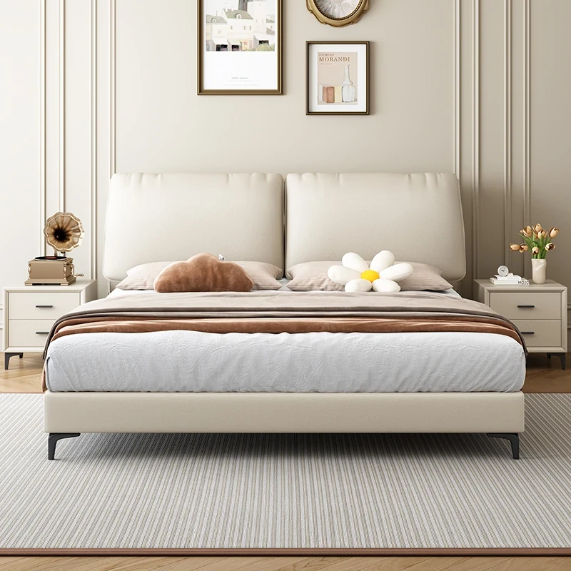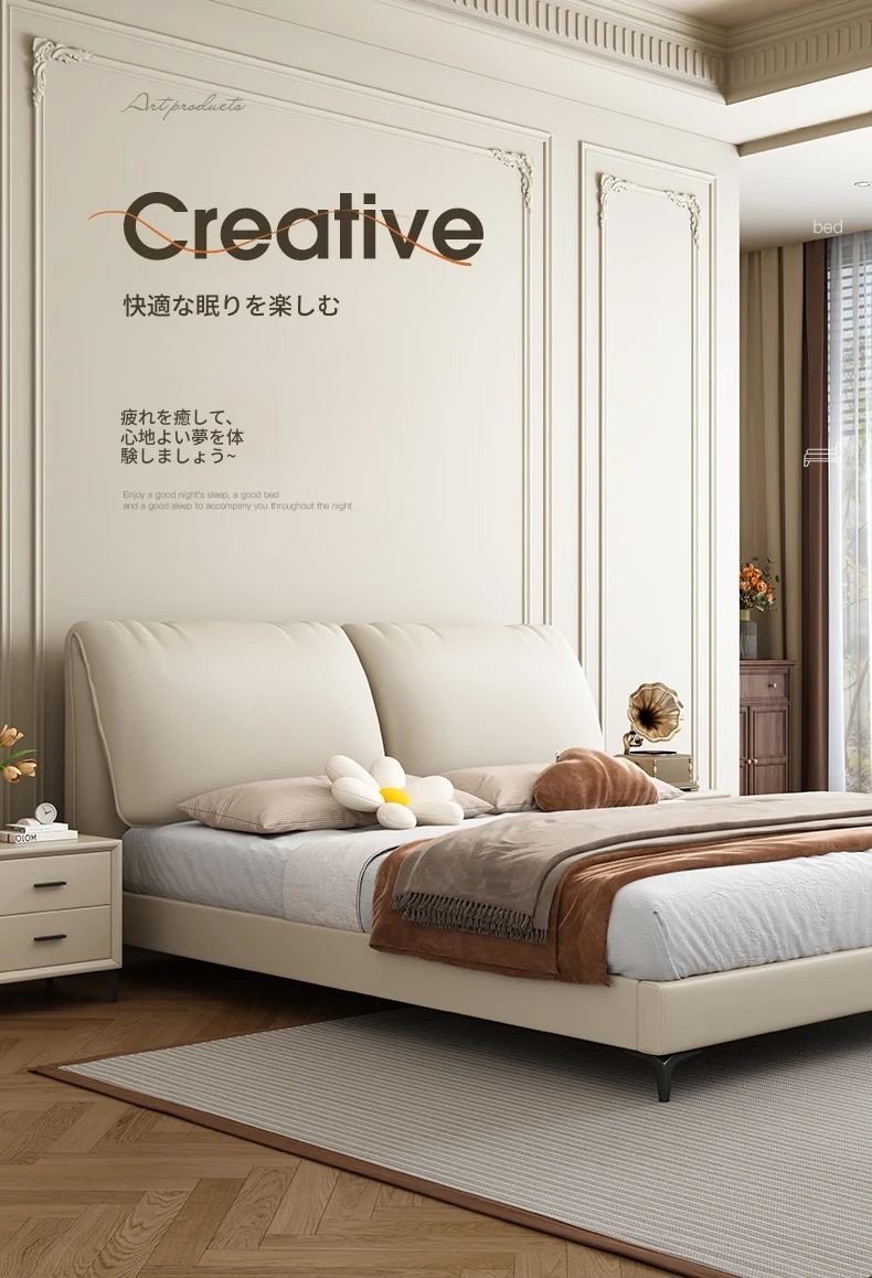 全実木製イタリアンミニマリスト大象耳デザインベッド - 主寝室用180cmダブルベッド!互いに干渉しない快適な眠りを提供するクリーミーな布製ベッド。おしゃれで機能的な空間を演出!