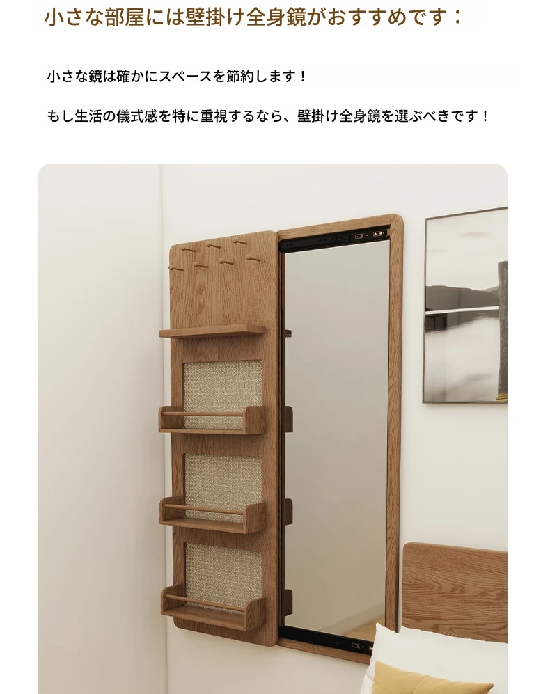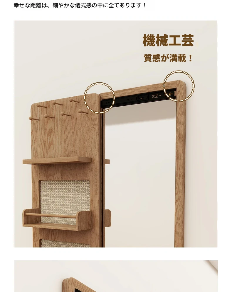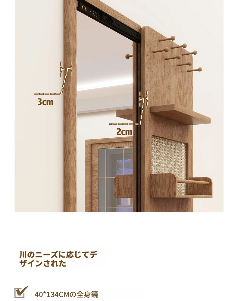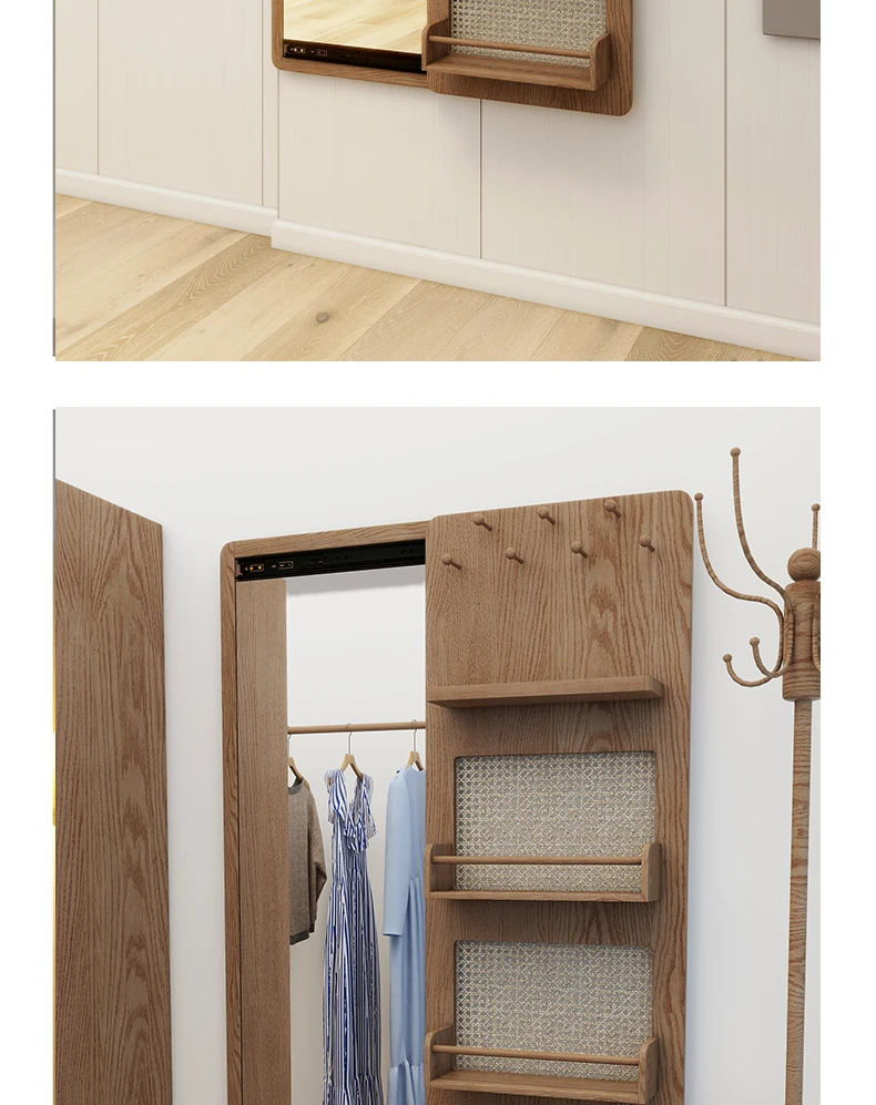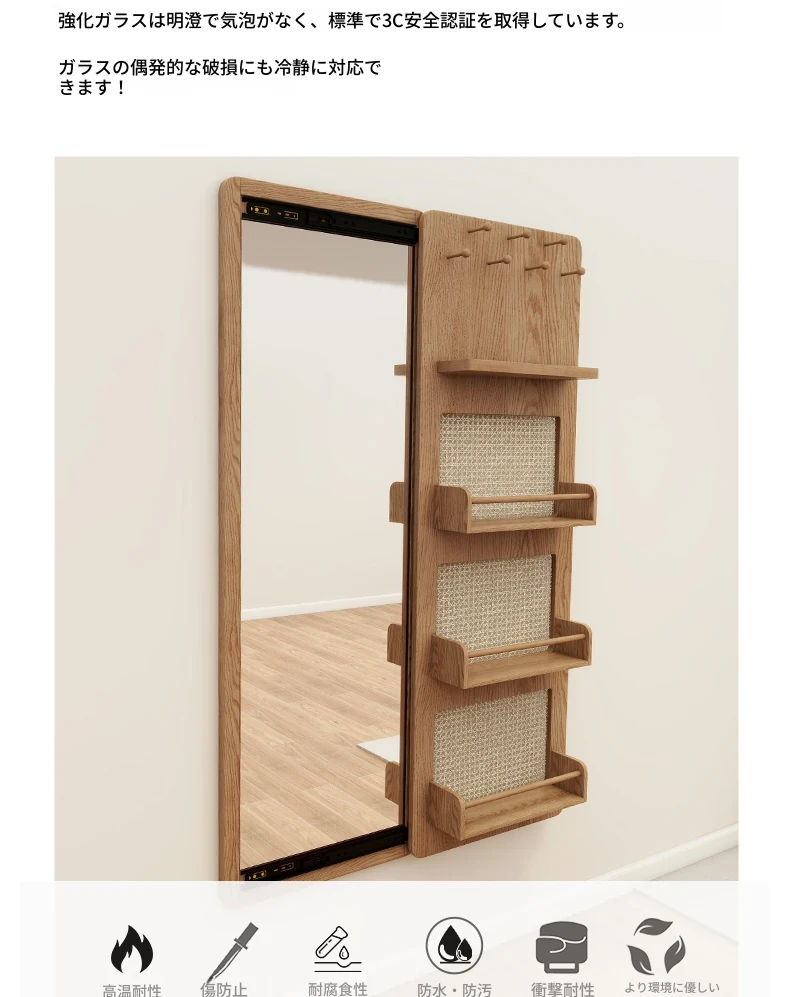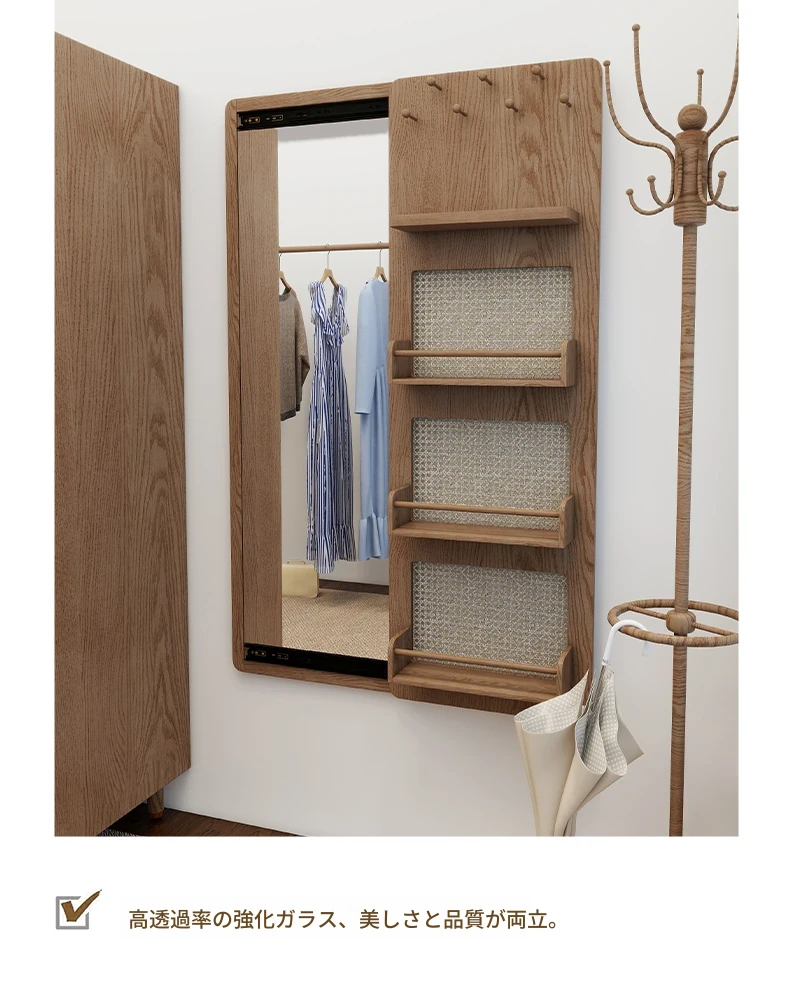 実木製のスライド式隠し全身鏡 - モダンでシンプルな日本風デザイン、寝室にぴったりな多機能壁掛けミラー!おしゃれな収納スペースで、空間を有効活用しながらスタイルアップを実現。