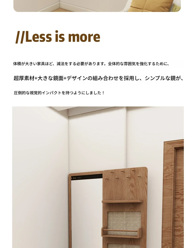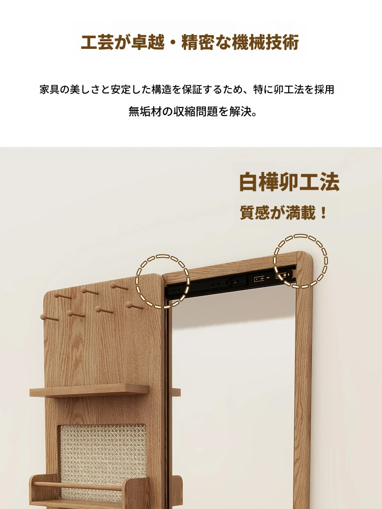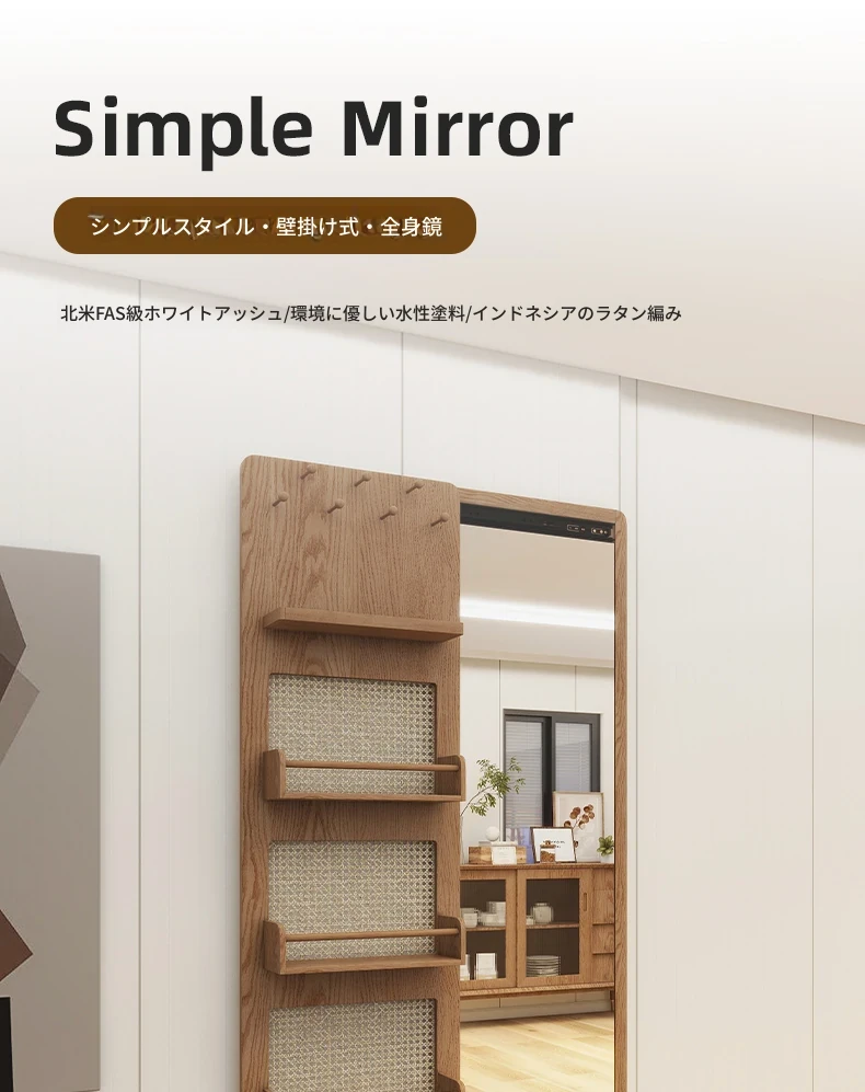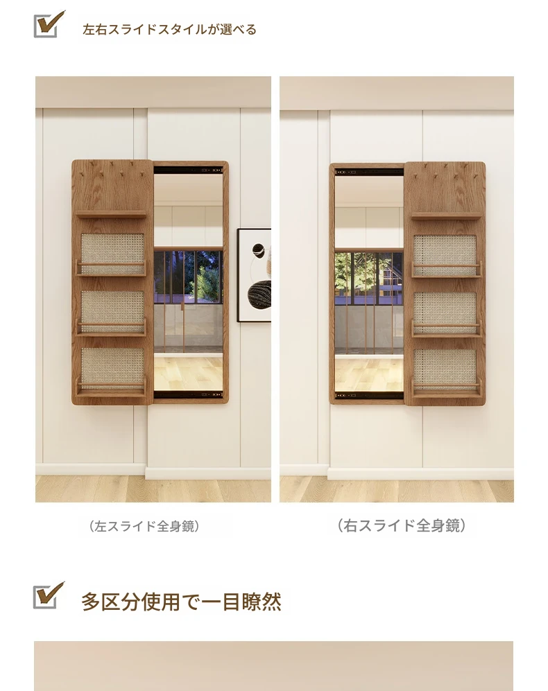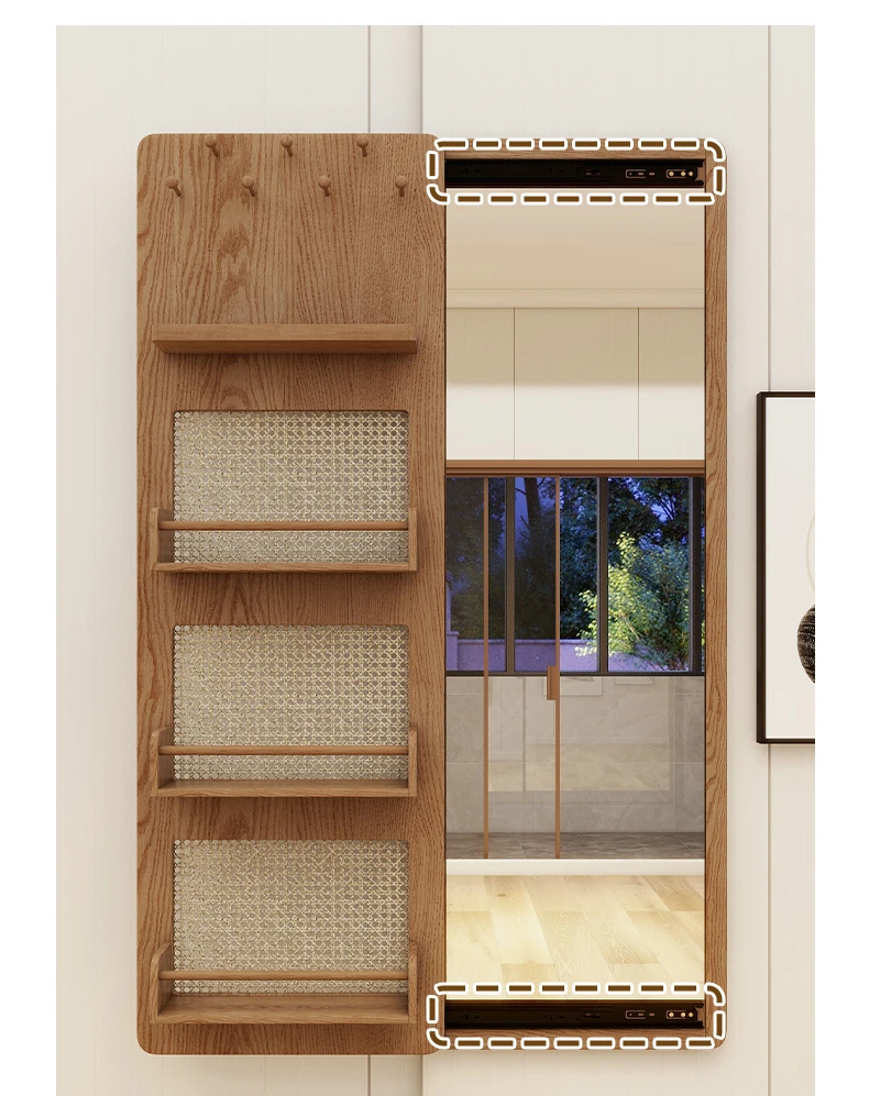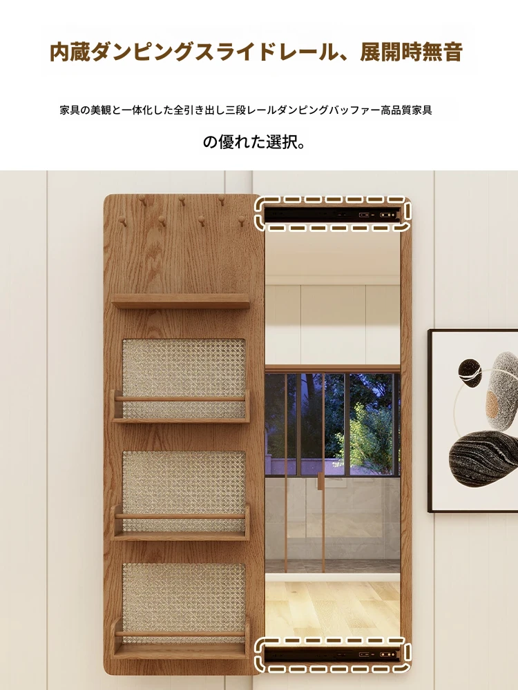 実木製のスライド式隠し全身鏡 - モダンでシンプルな日本風デザイン、寝室にぴったりな多機能壁掛けミラー!おしゃれな収納スペースで、空間を有効活用しながらスタイルアップを実現。