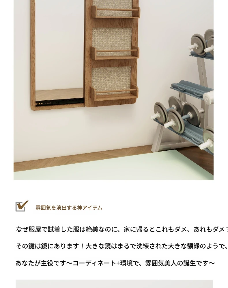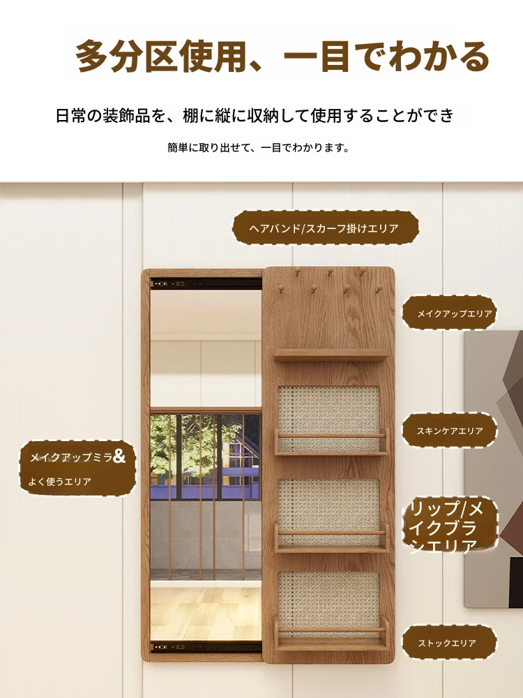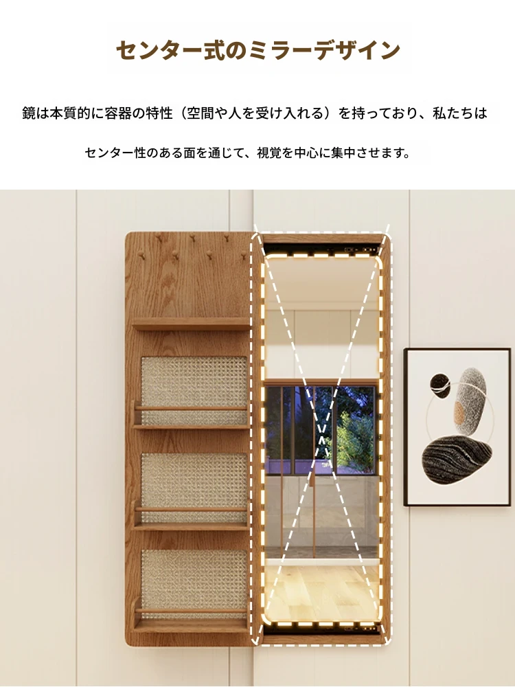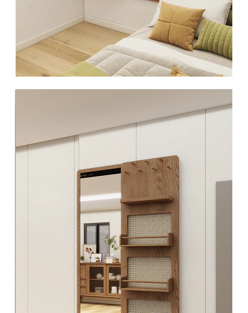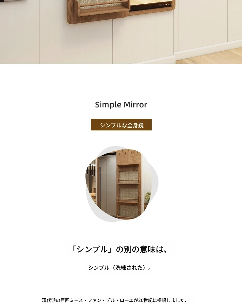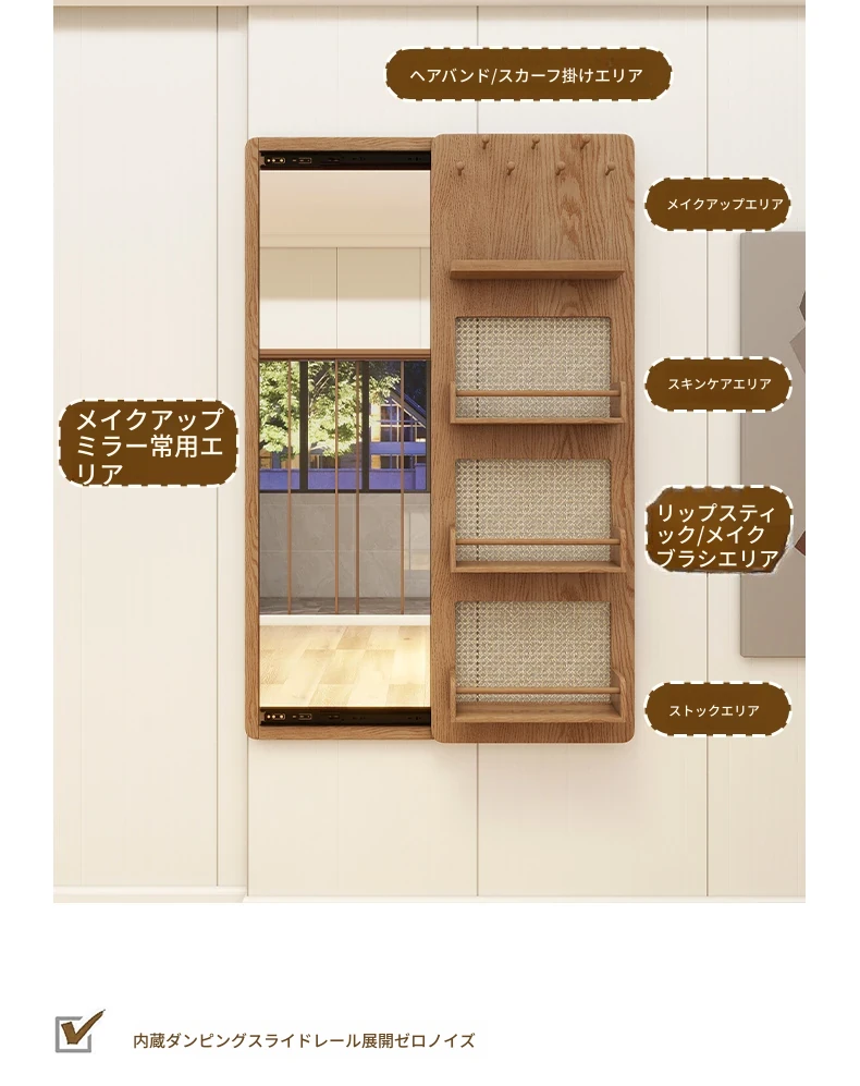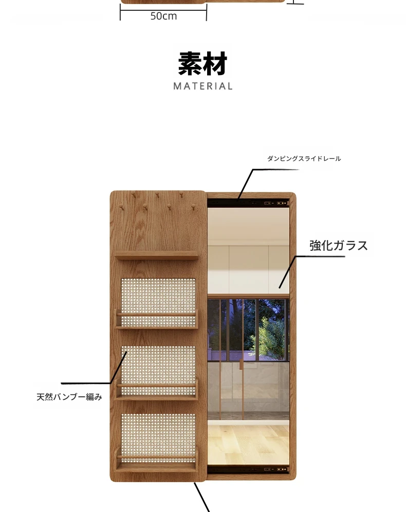 実木製のスライド式隠し全身鏡 - モダンでシンプルな日本風デザイン、寝室にぴったりな多機能壁掛けミラー!おしゃれな収納スペースで、空間を有効活用しながらスタイルアップを実現。