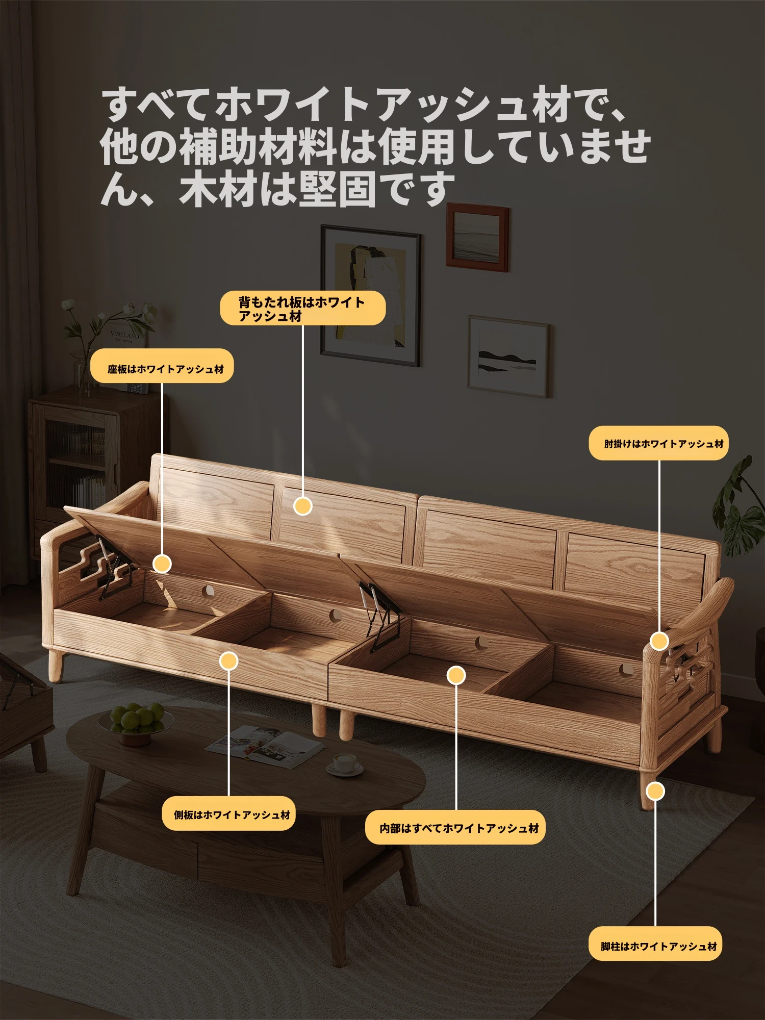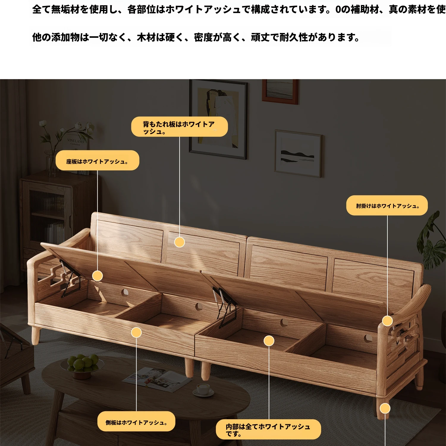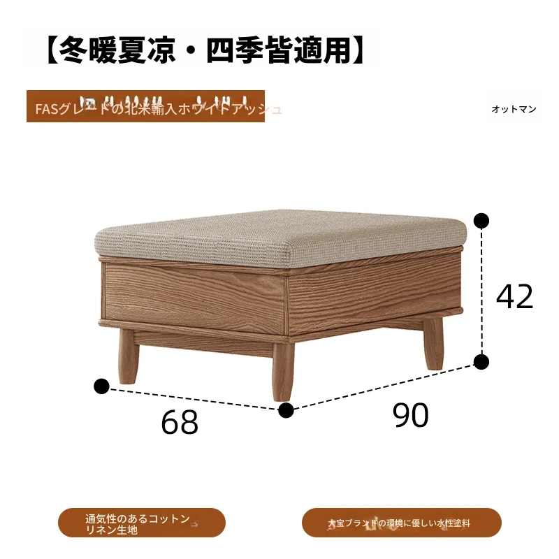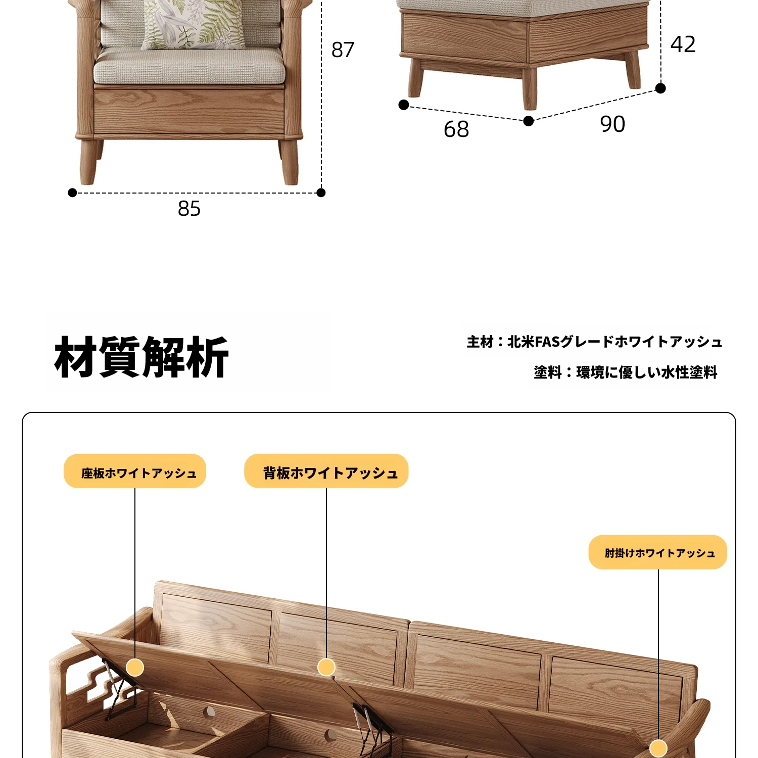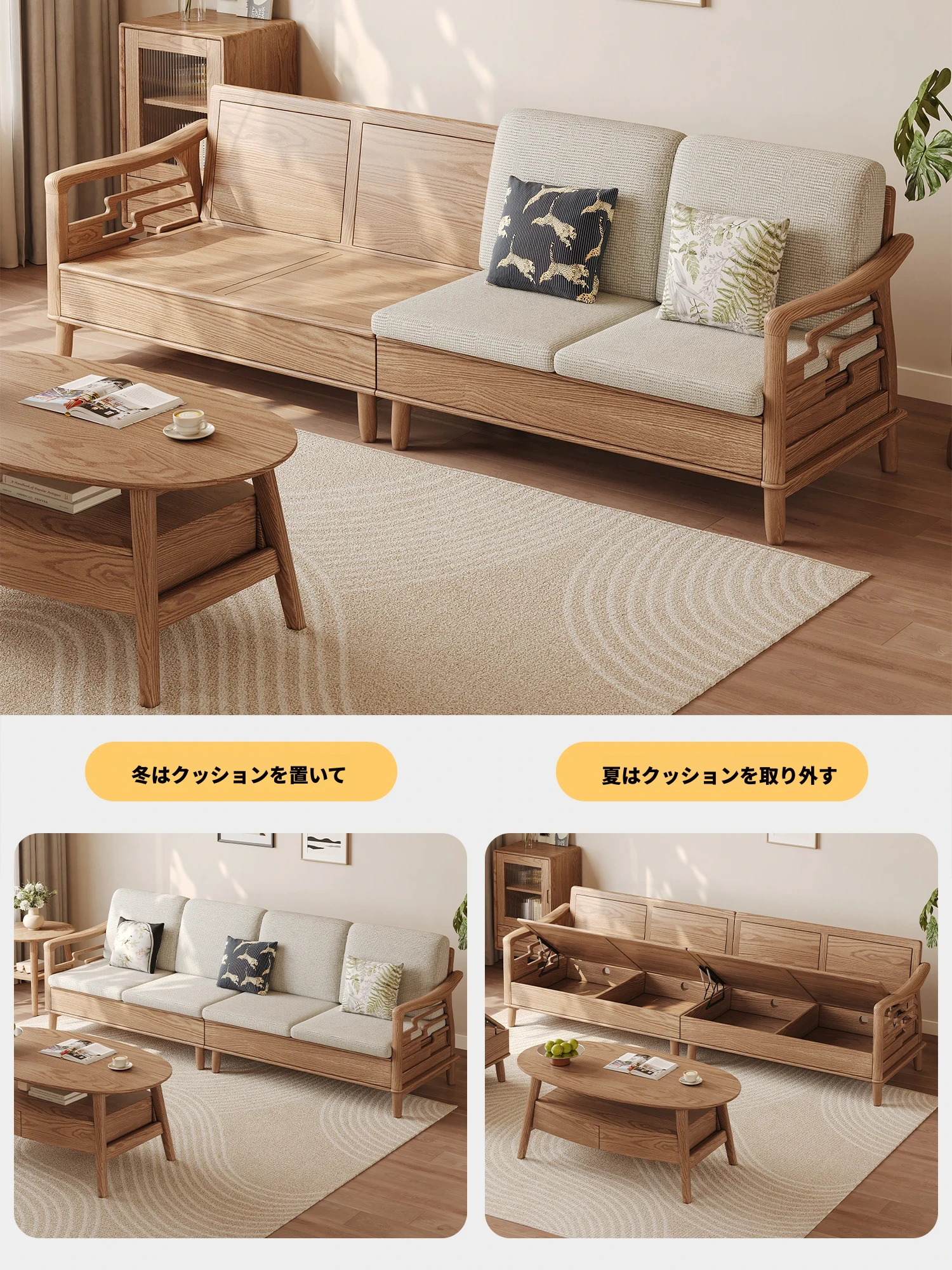 上進ホワイトアッシュ無垢材ソファセット|現代的シンプルデザイン|小型リビングに最適|冬夏兼用|高収納ボックス付き|機能的でスタイリッシュな家具