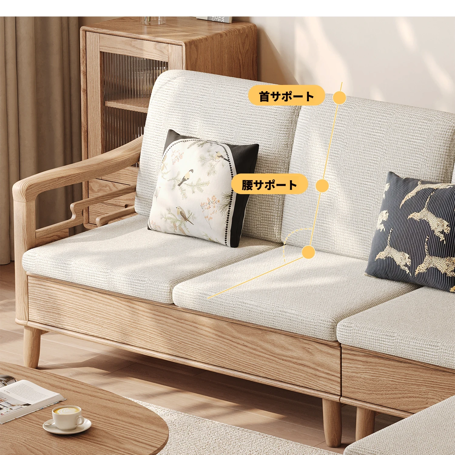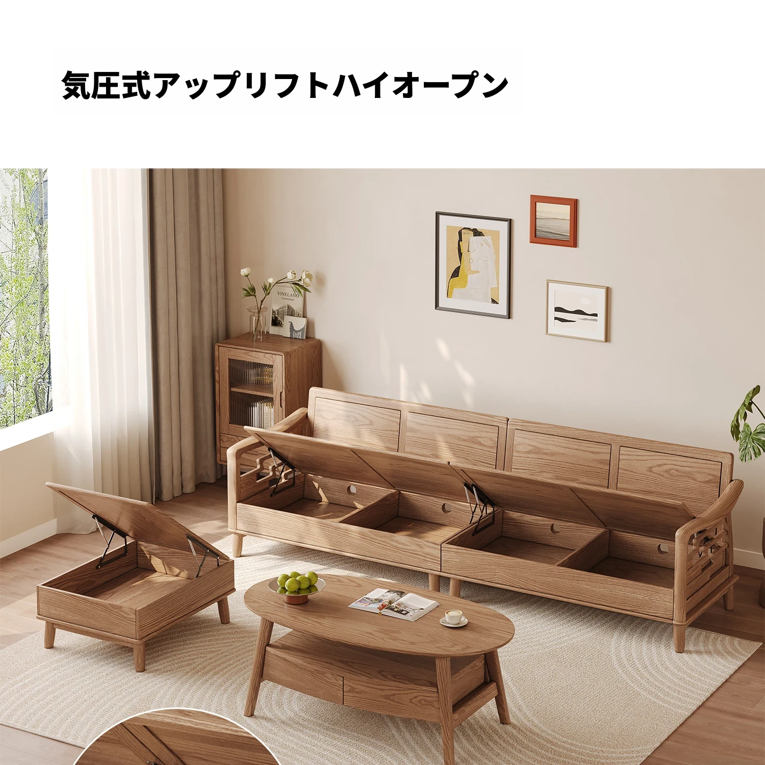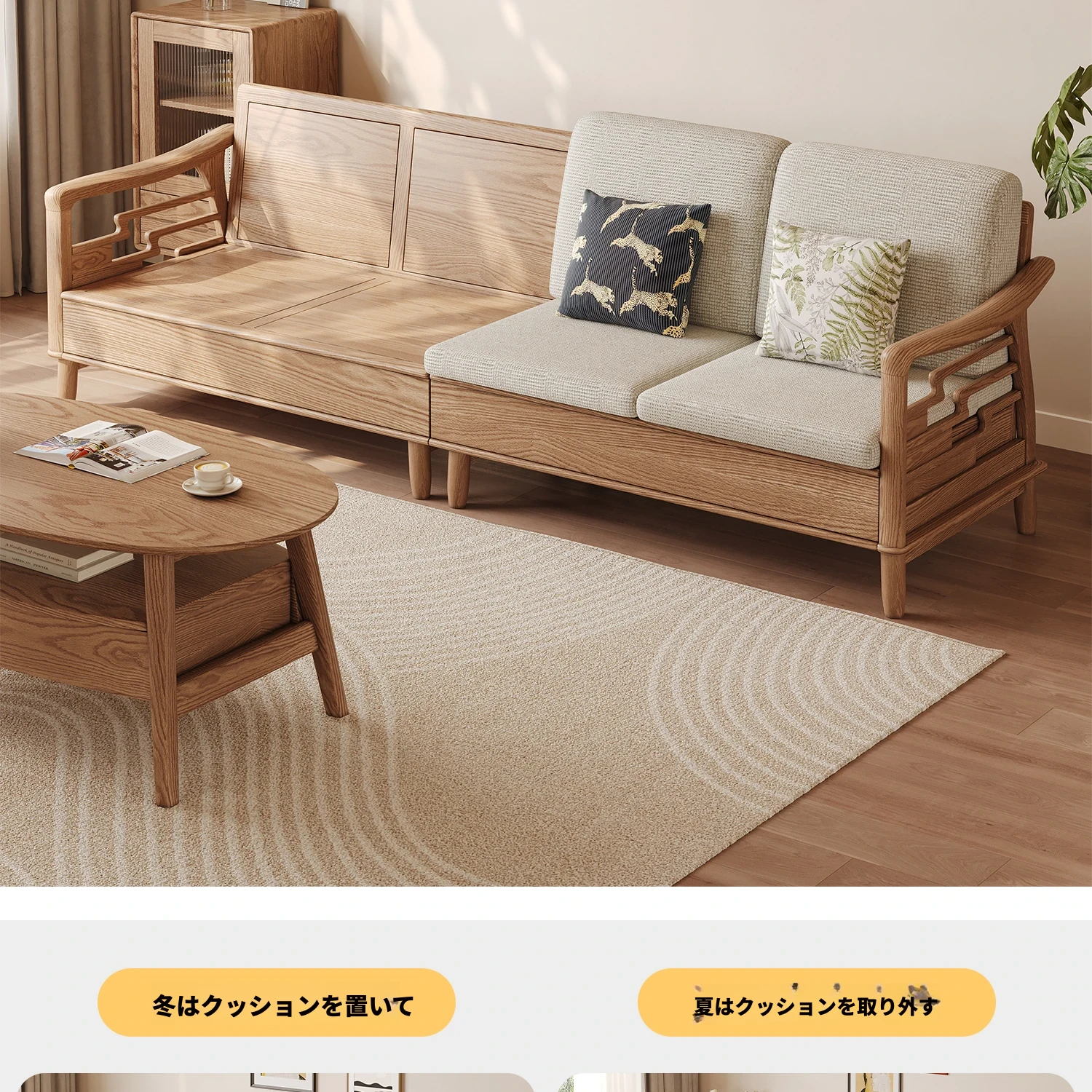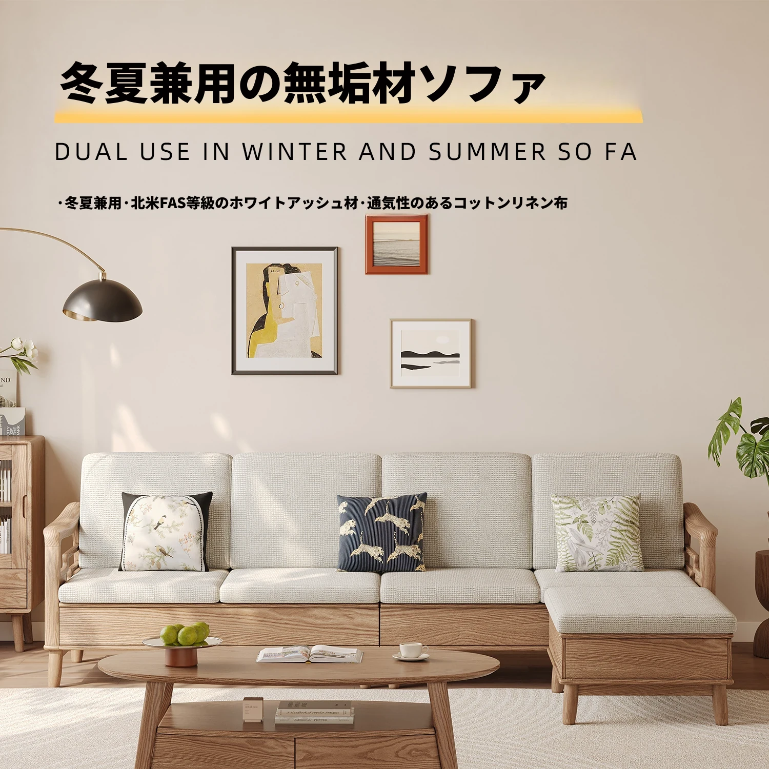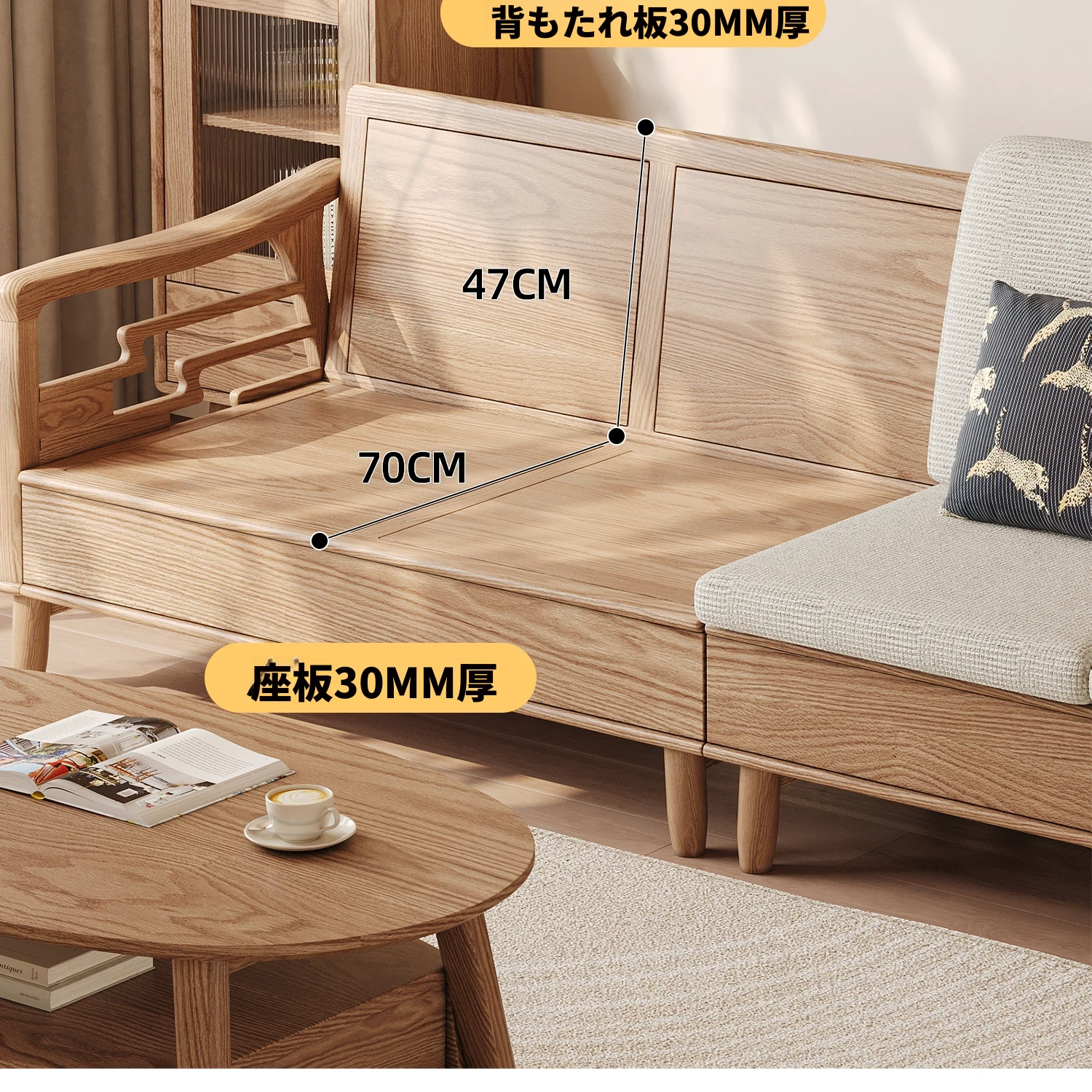 上進ホワイトアッシュ無垢材ソファセット|現代的シンプルデザイン|小型リビングに最適|冬夏兼用|高収納ボックス付き|機能的でスタイリッシュな家具