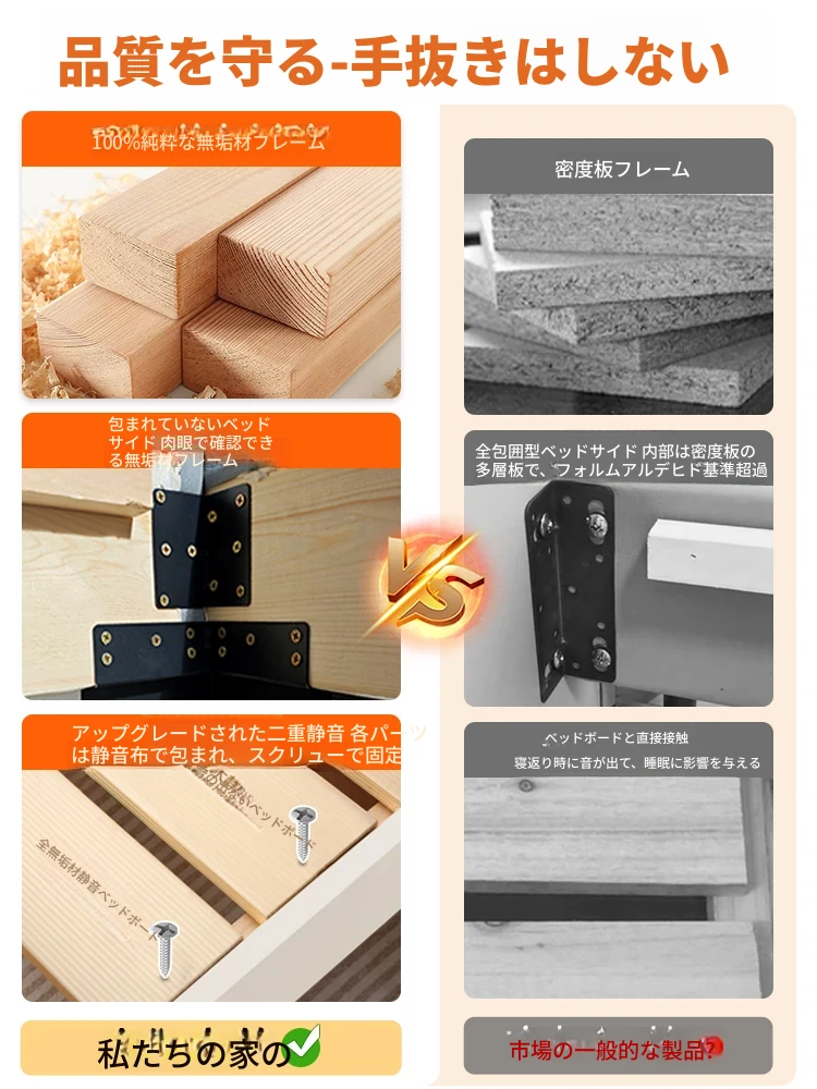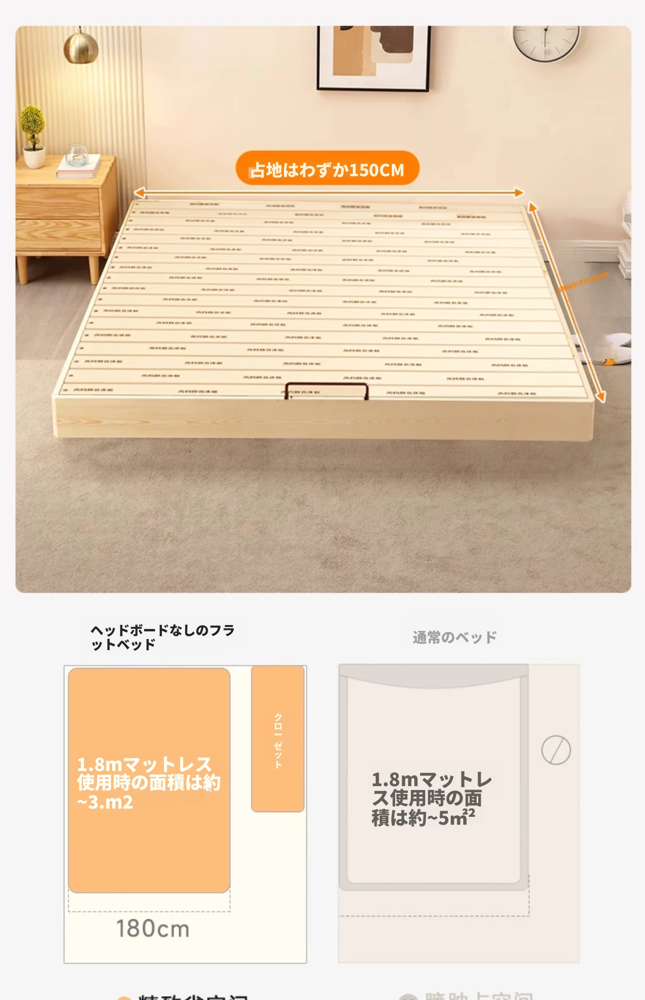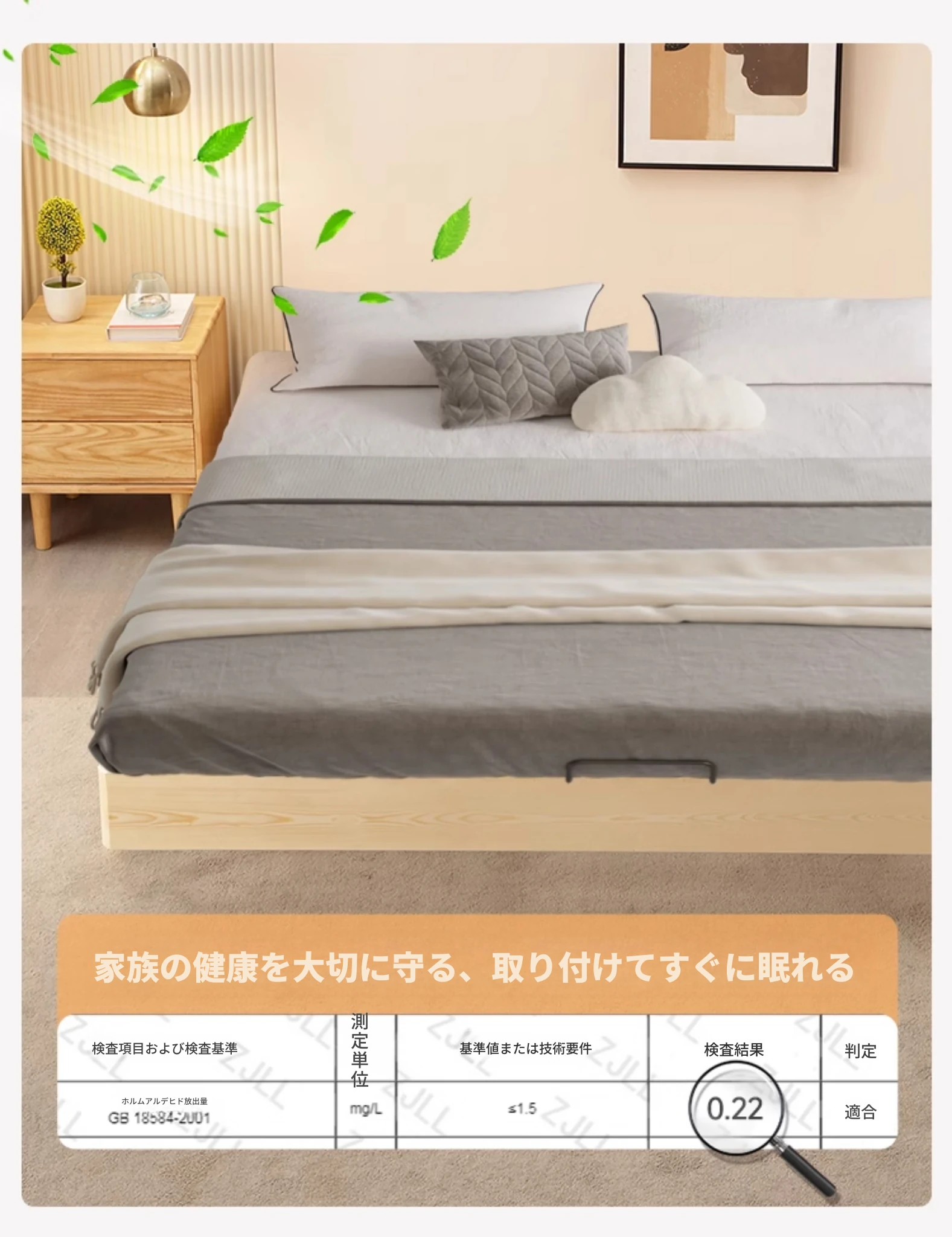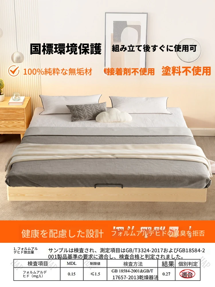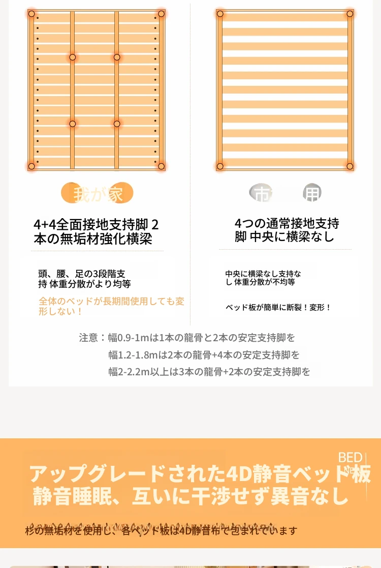 【加密版】無垢材浮遊静音ベッド (全体が無垢材 接合なし)