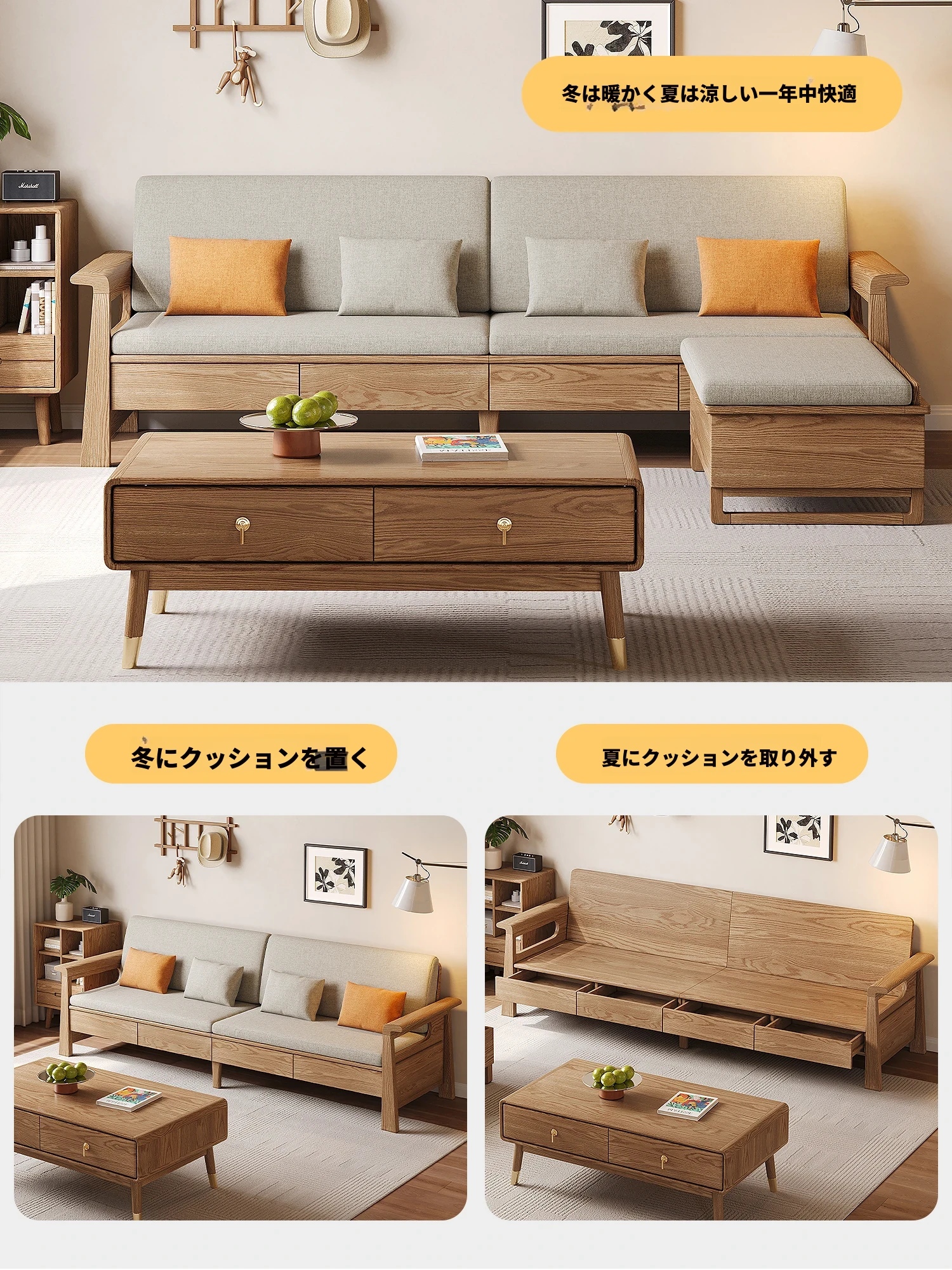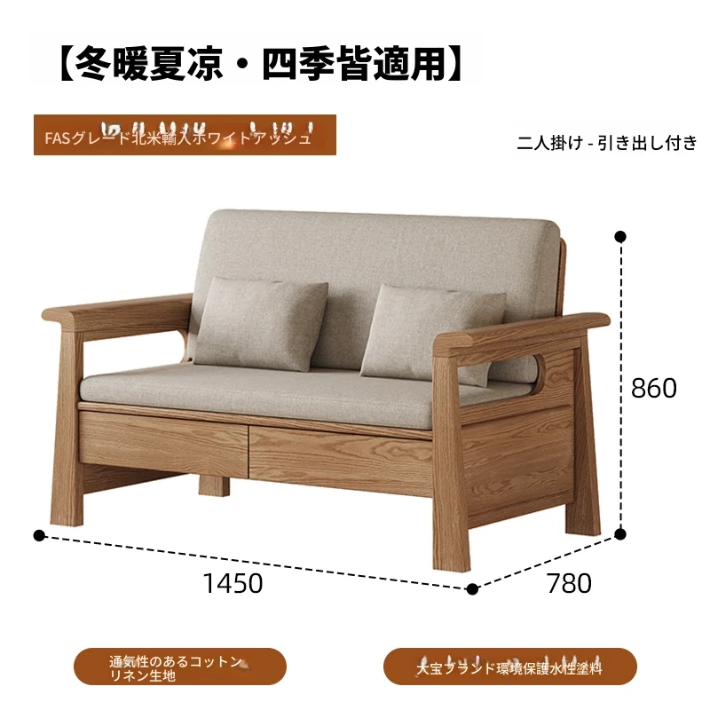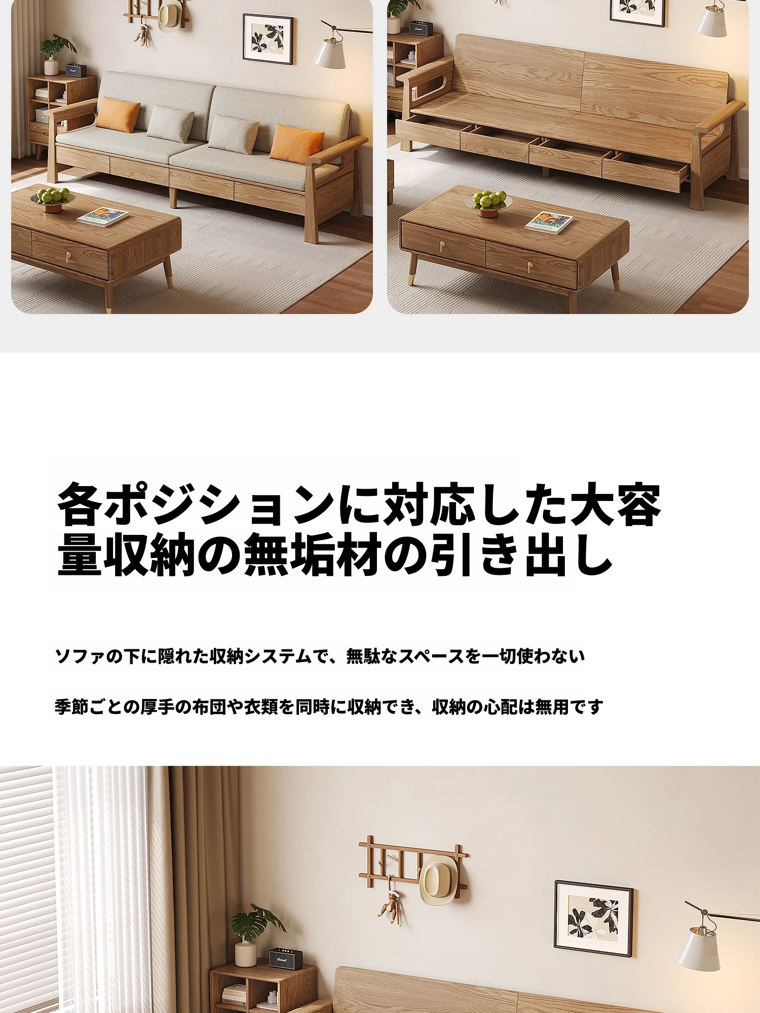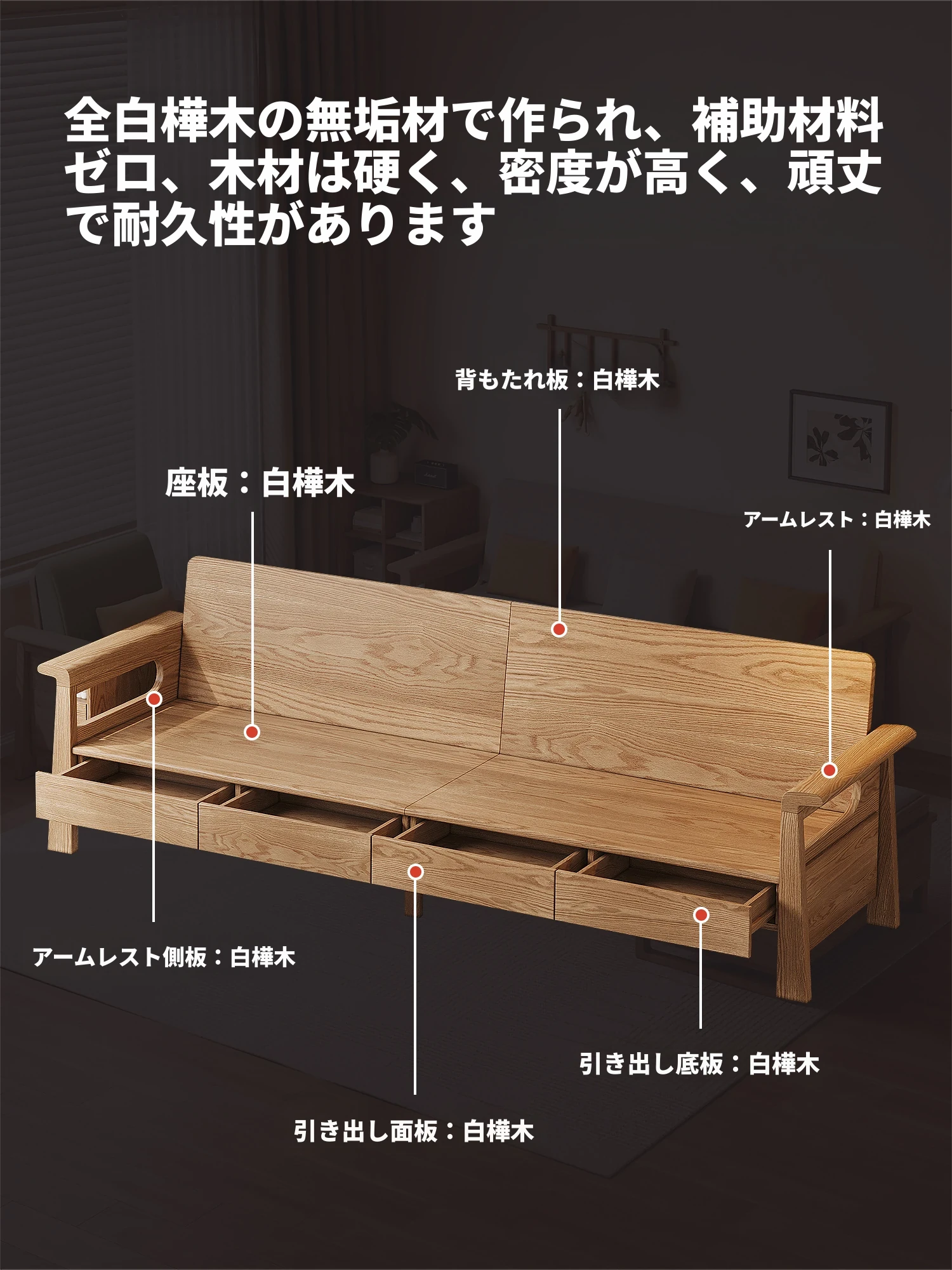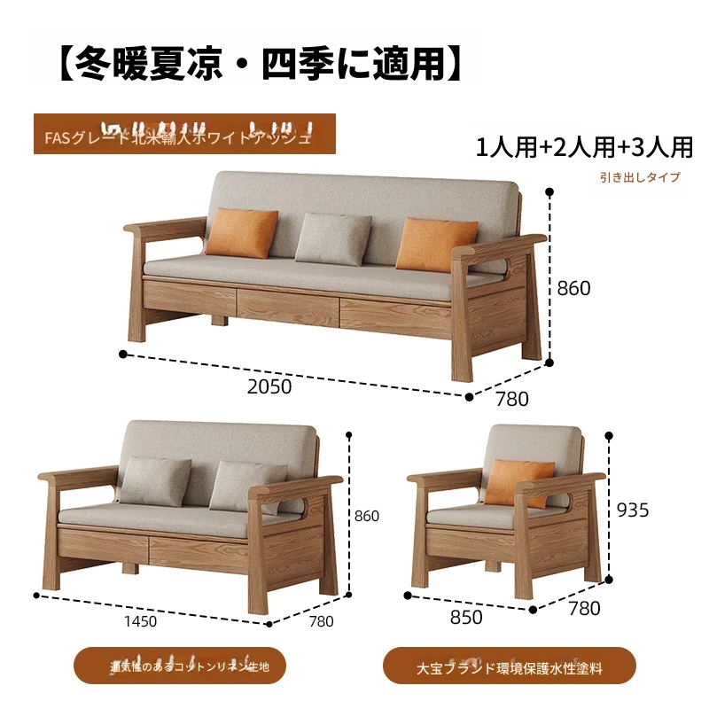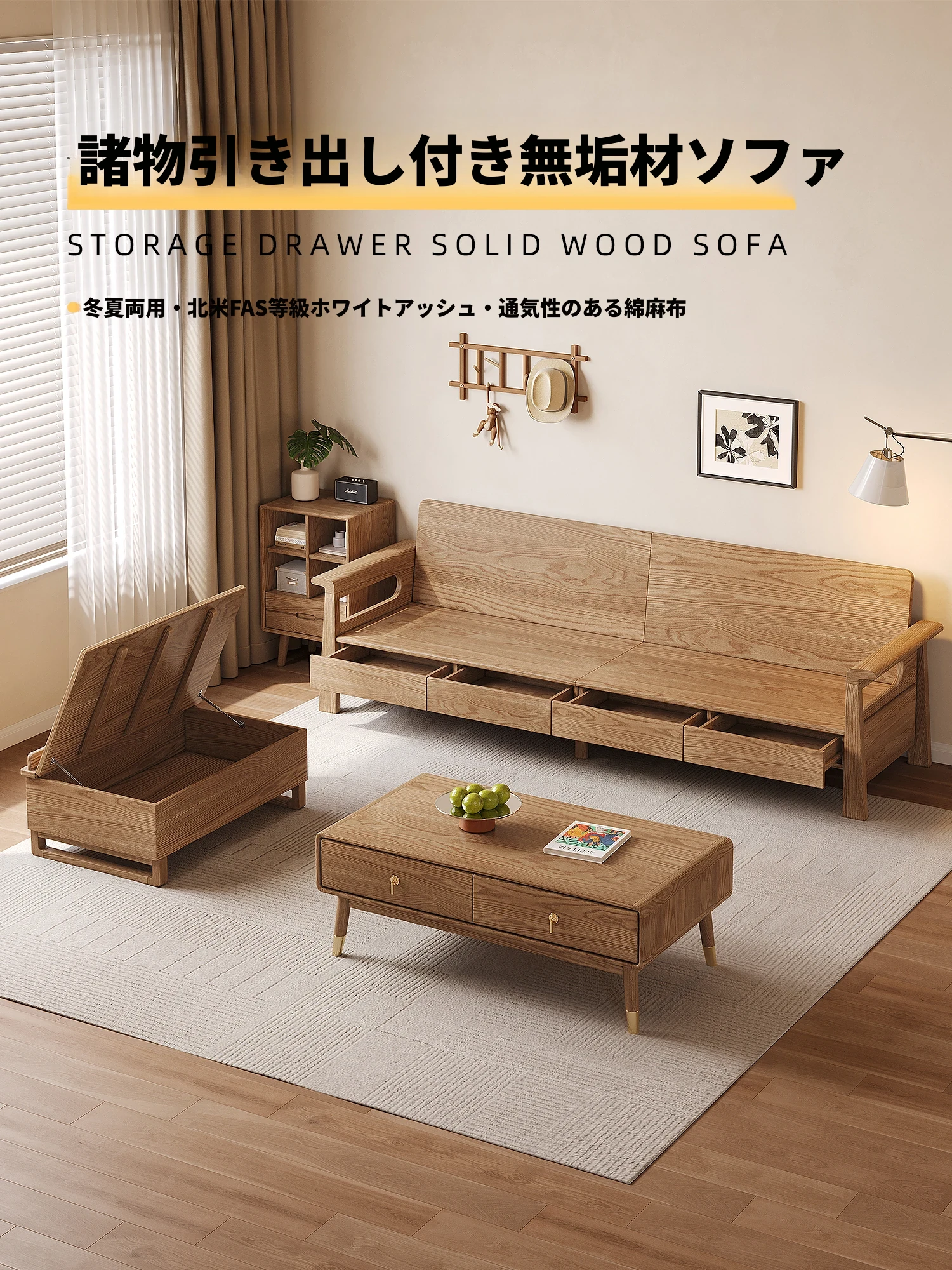 北欧スタイルの全木製ソファセット|モダンでシンプルなデザイン|冬夏兼用|ホワイトアッシュの引き出し収納付き|小型から大型のリビングに最適!