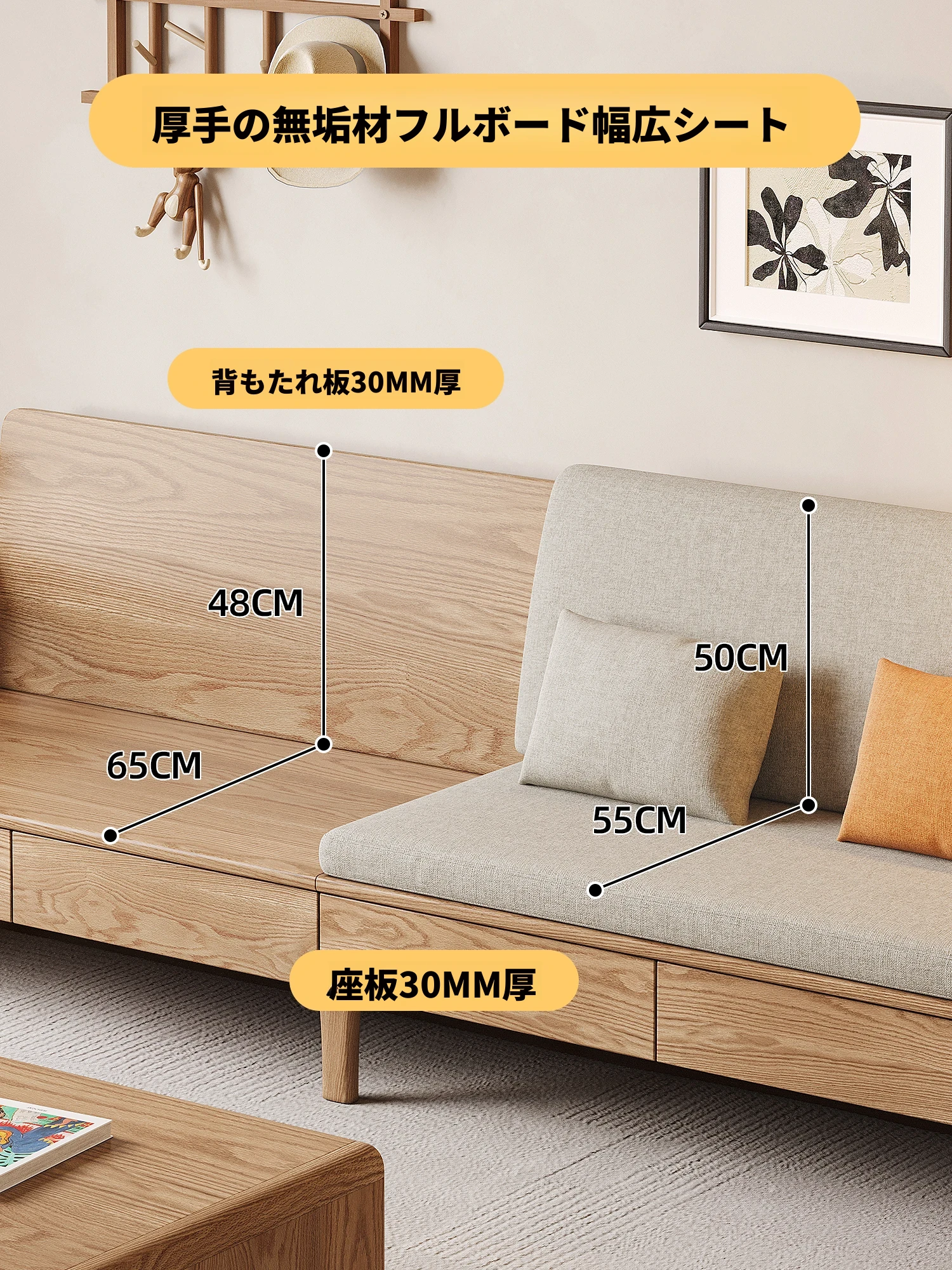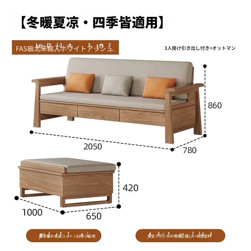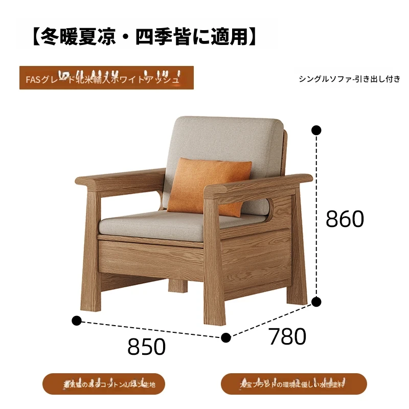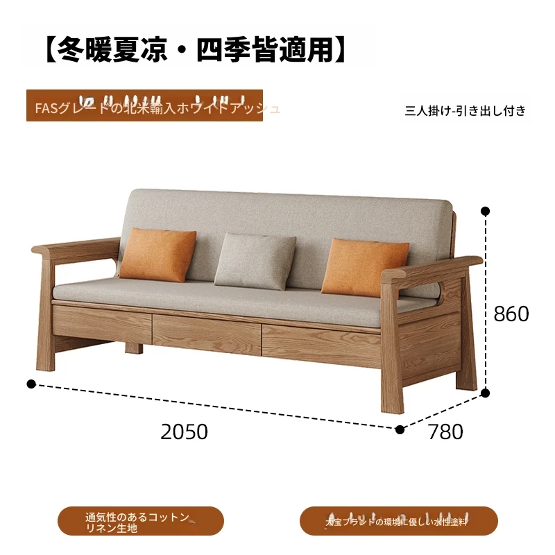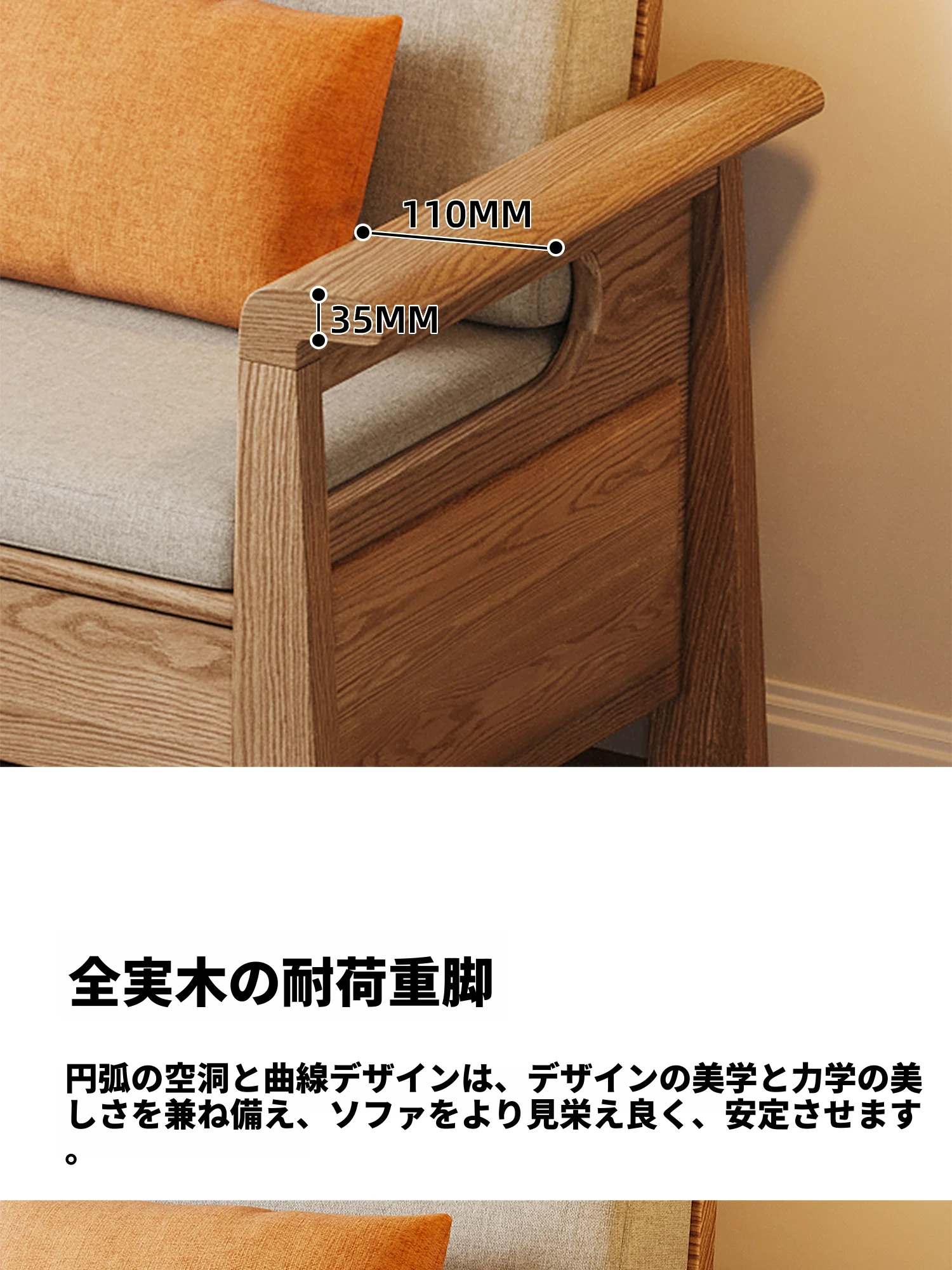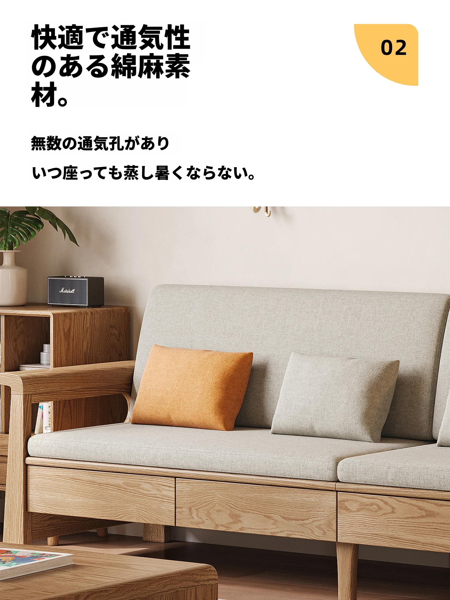 北欧スタイルの全木製ソファセット|モダンでシンプルなデザイン|冬夏兼用|ホワイトアッシュの引き出し収納付き|小型から大型のリビングに最適!