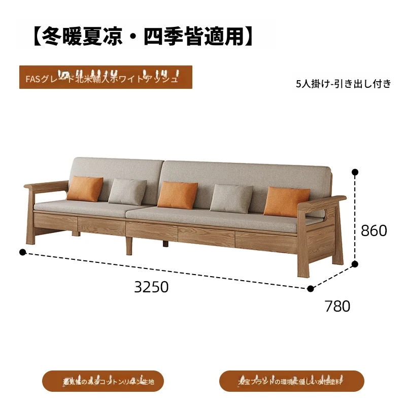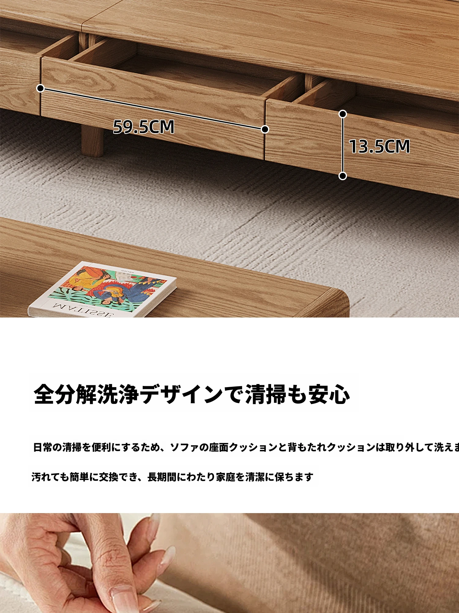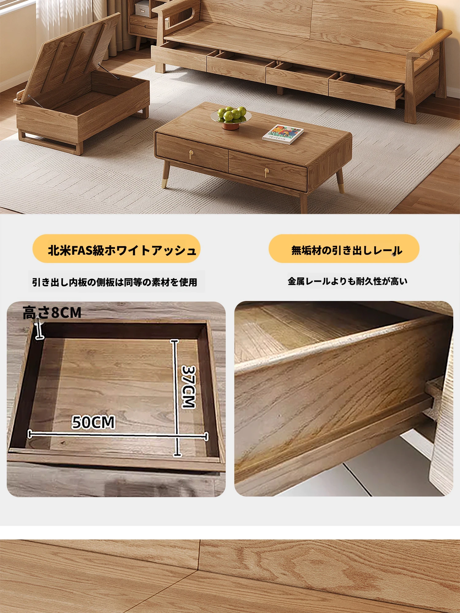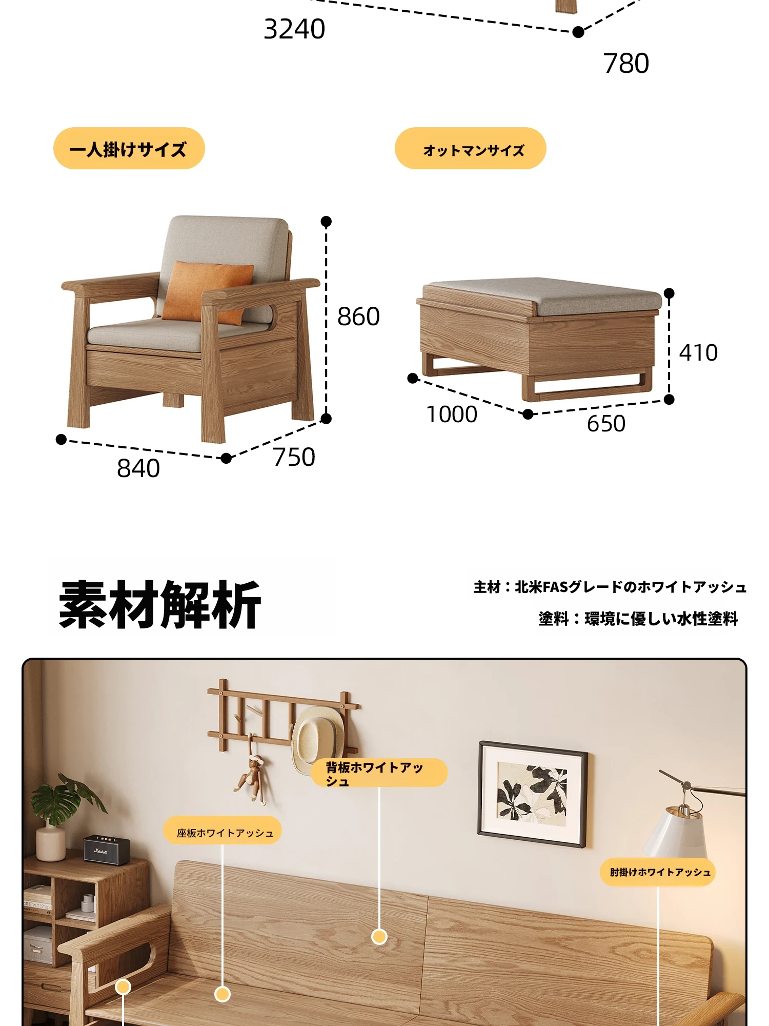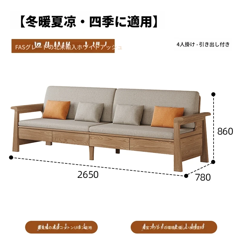 北欧スタイルの全木製ソファセット|モダンでシンプルなデザイン|冬夏兼用|ホワイトアッシュの引き出し収納付き|小型から大型のリビングに最適!