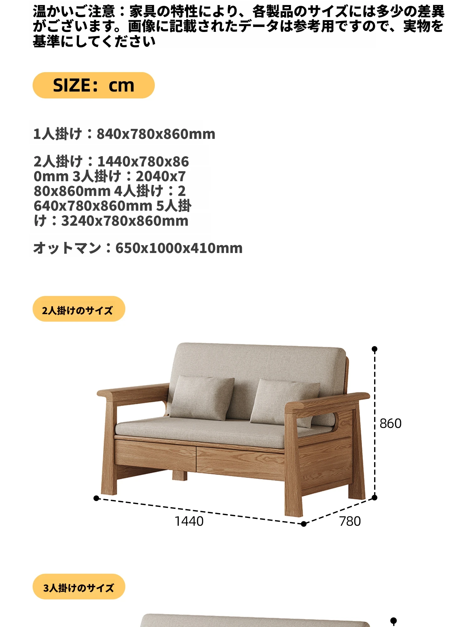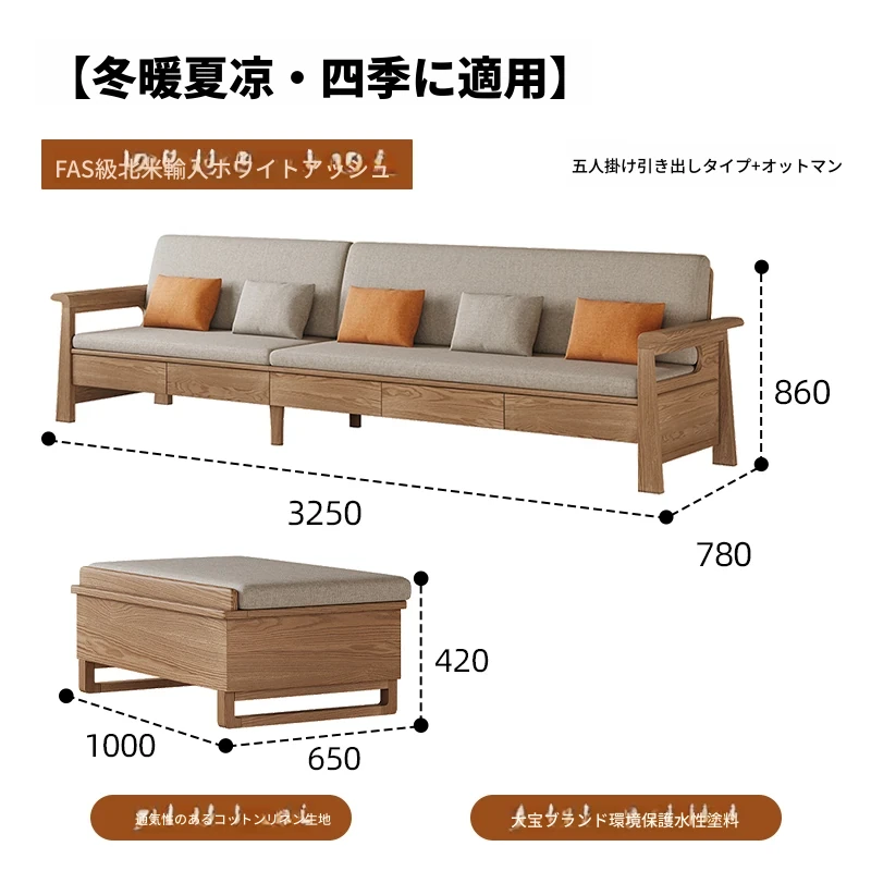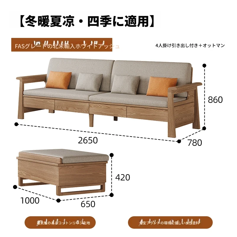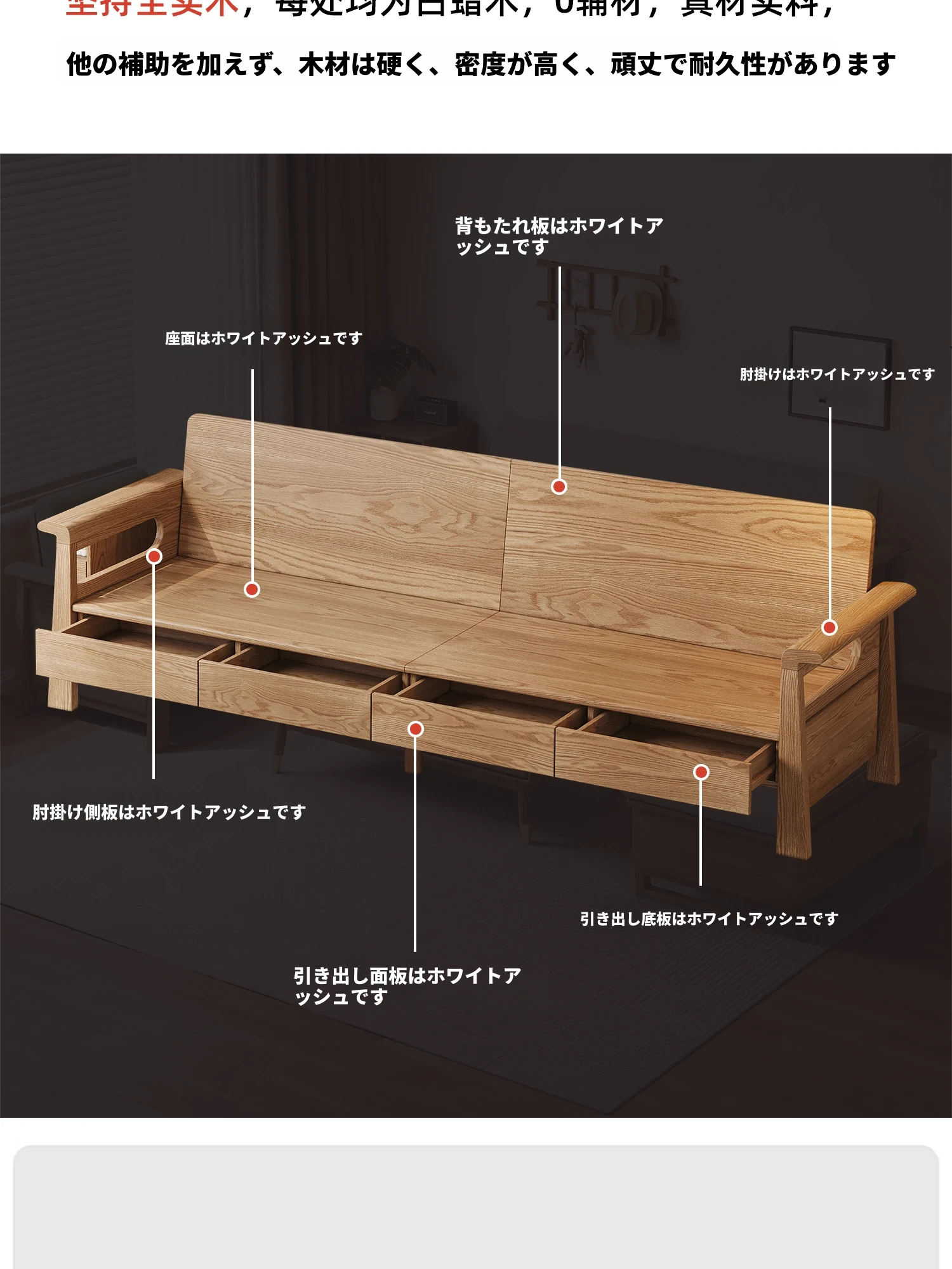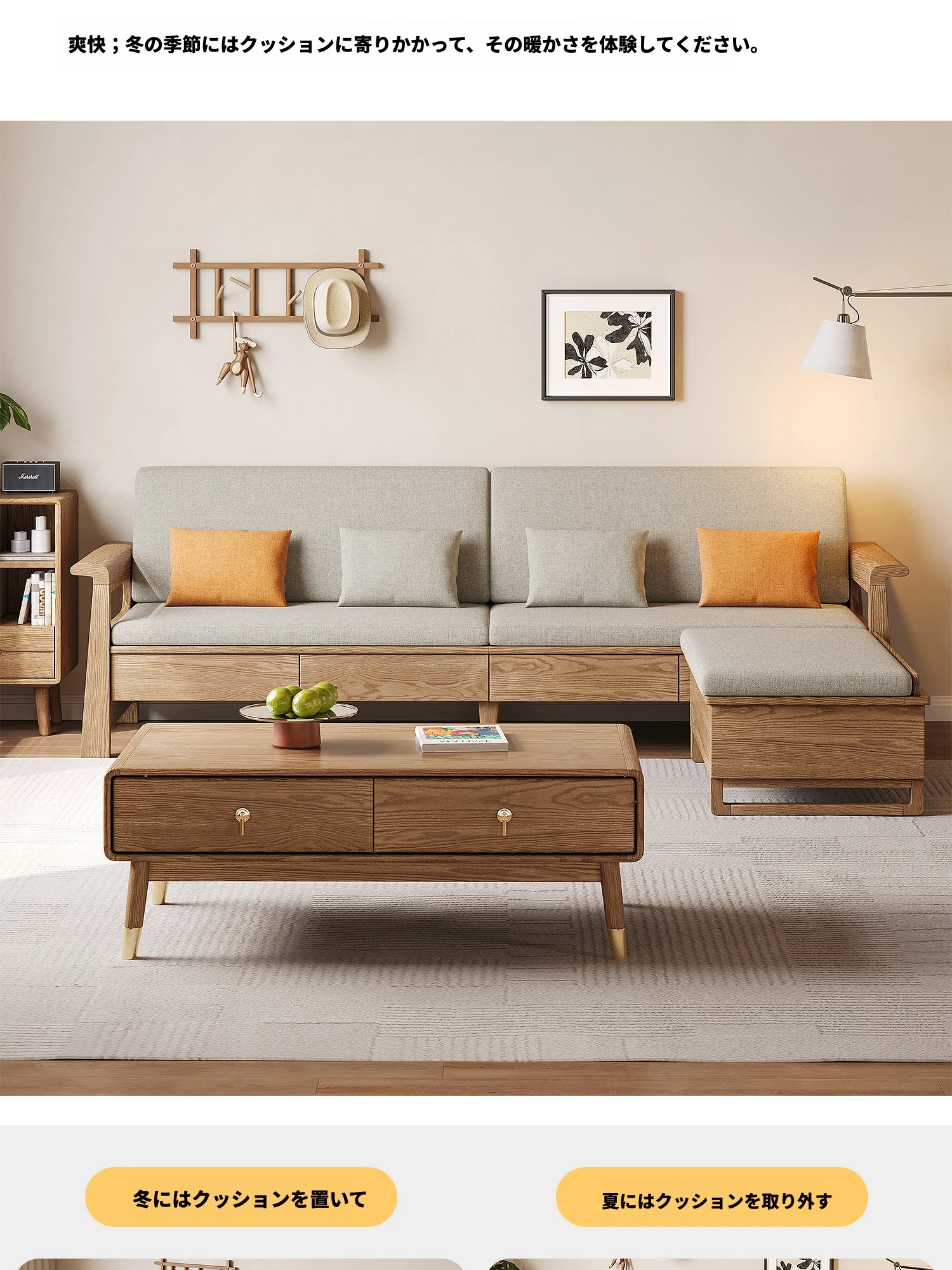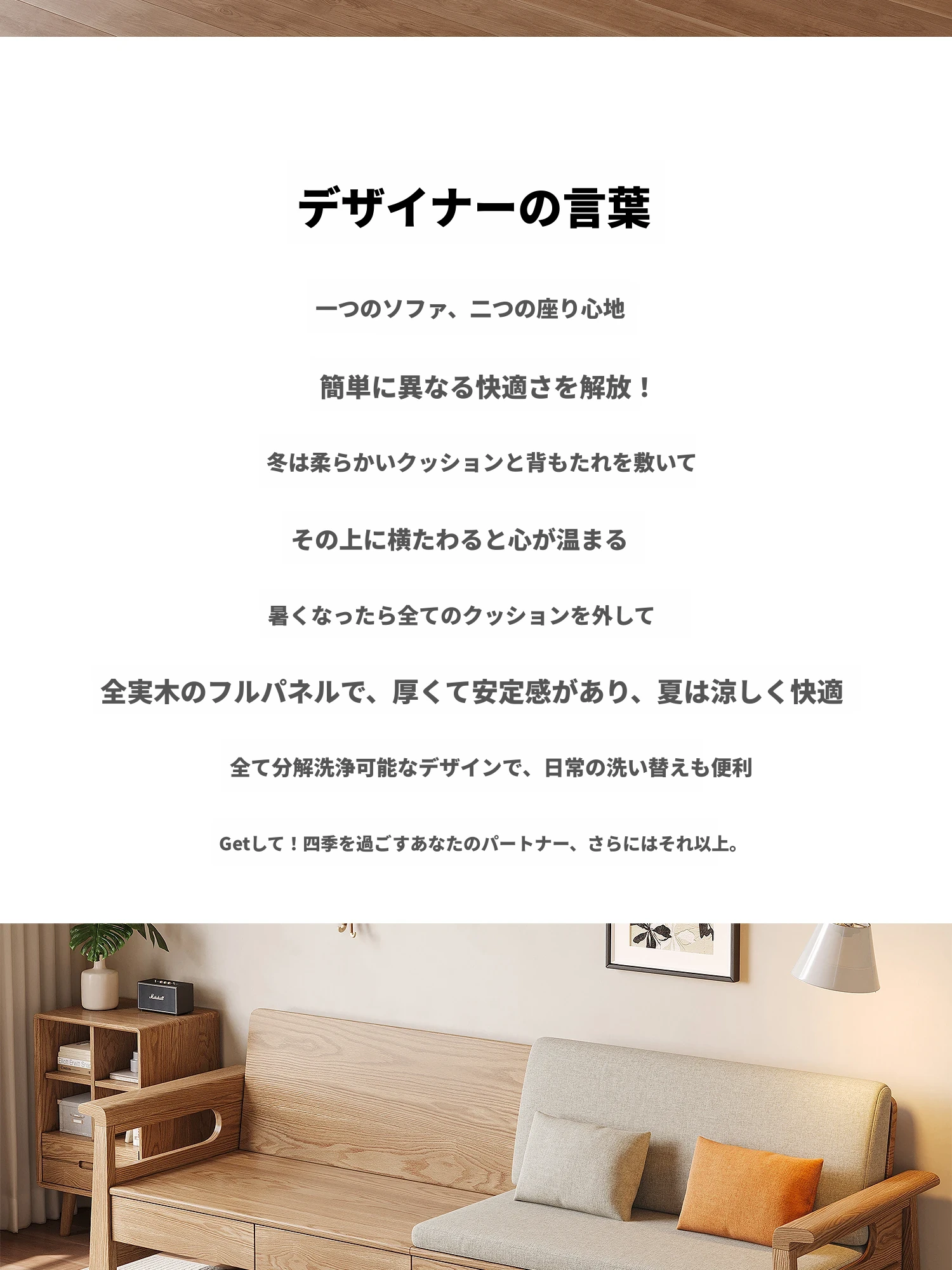 北欧スタイルの全木製ソファセット|モダンでシンプルなデザイン|冬夏兼用|ホワイトアッシュの引き出し収納付き|小型から大型のリビングに最適!