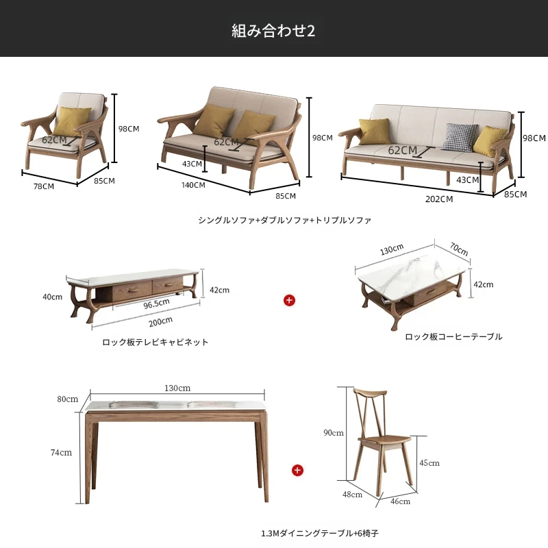 【三人用+コーヒーテーブル+テレビキャビネット+一卓6椅子(1.3メートル)】