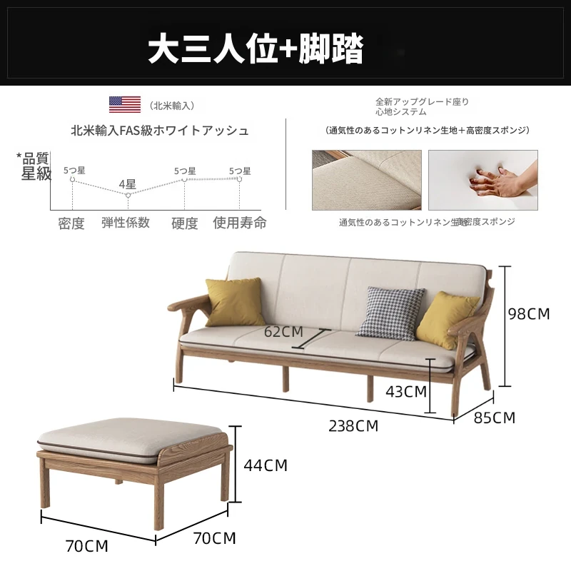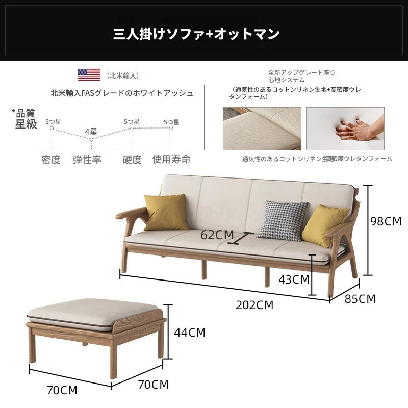 【【輸入FAS級ホワイトアッシュ】三人用+オットマン】
