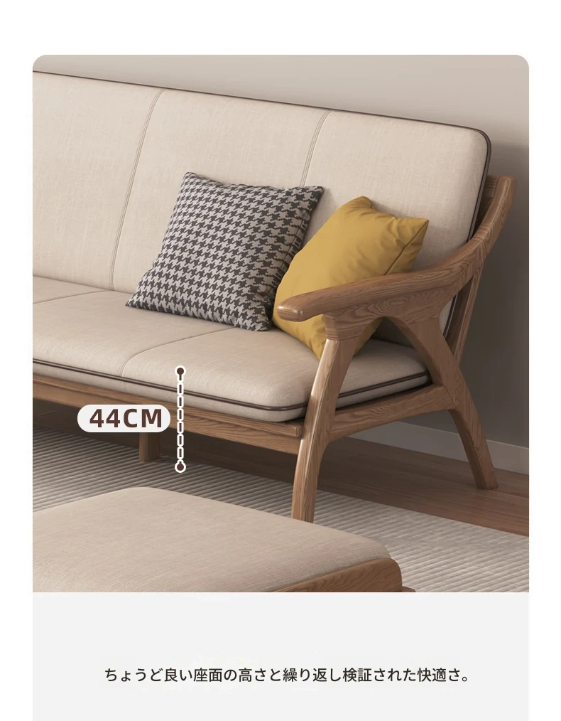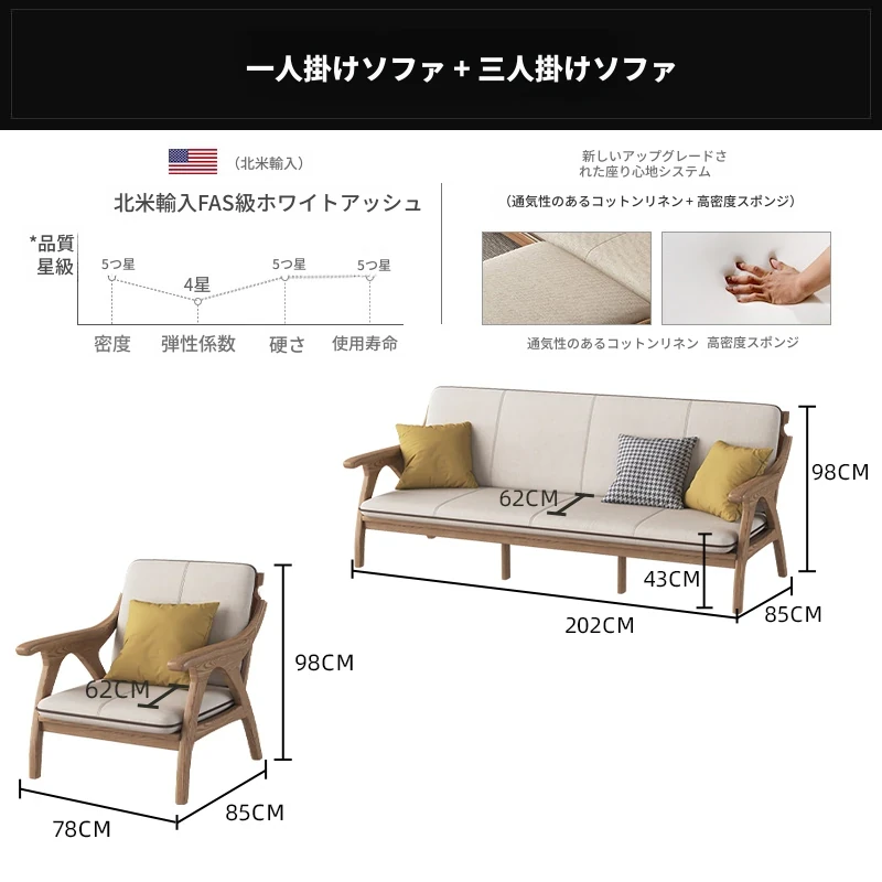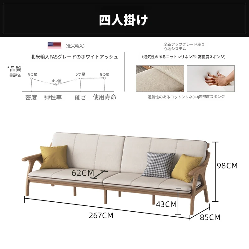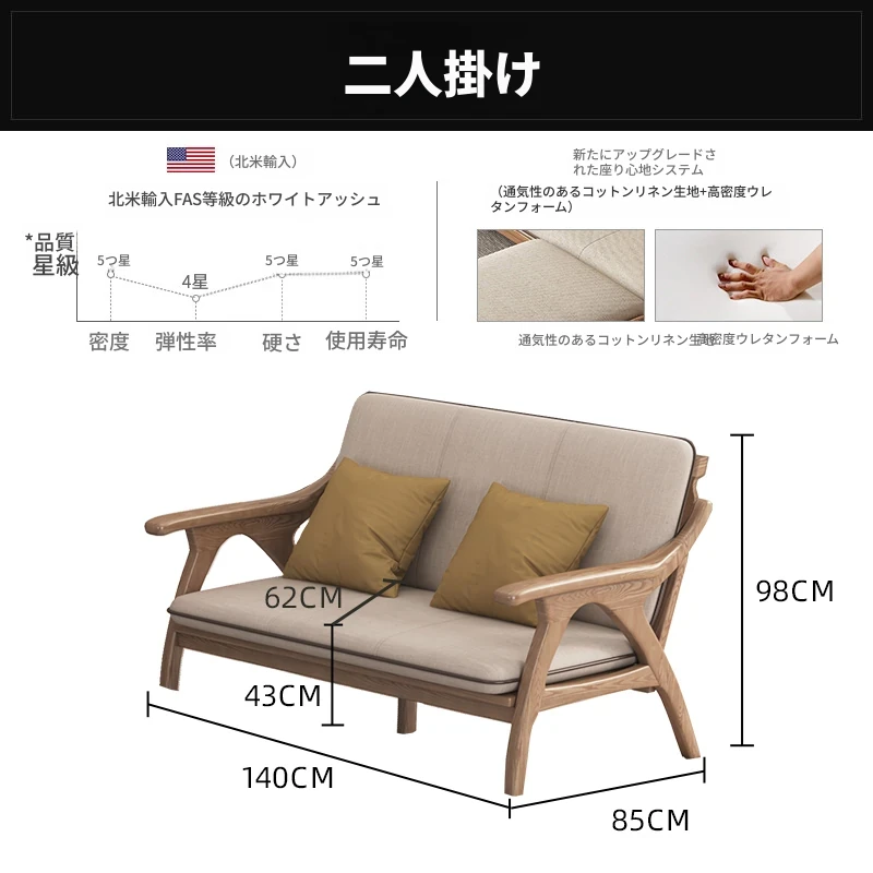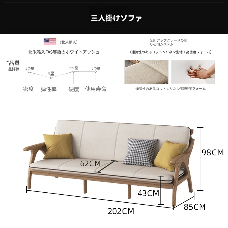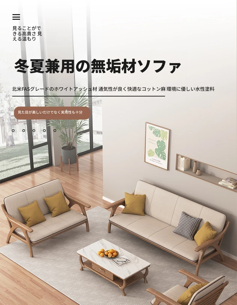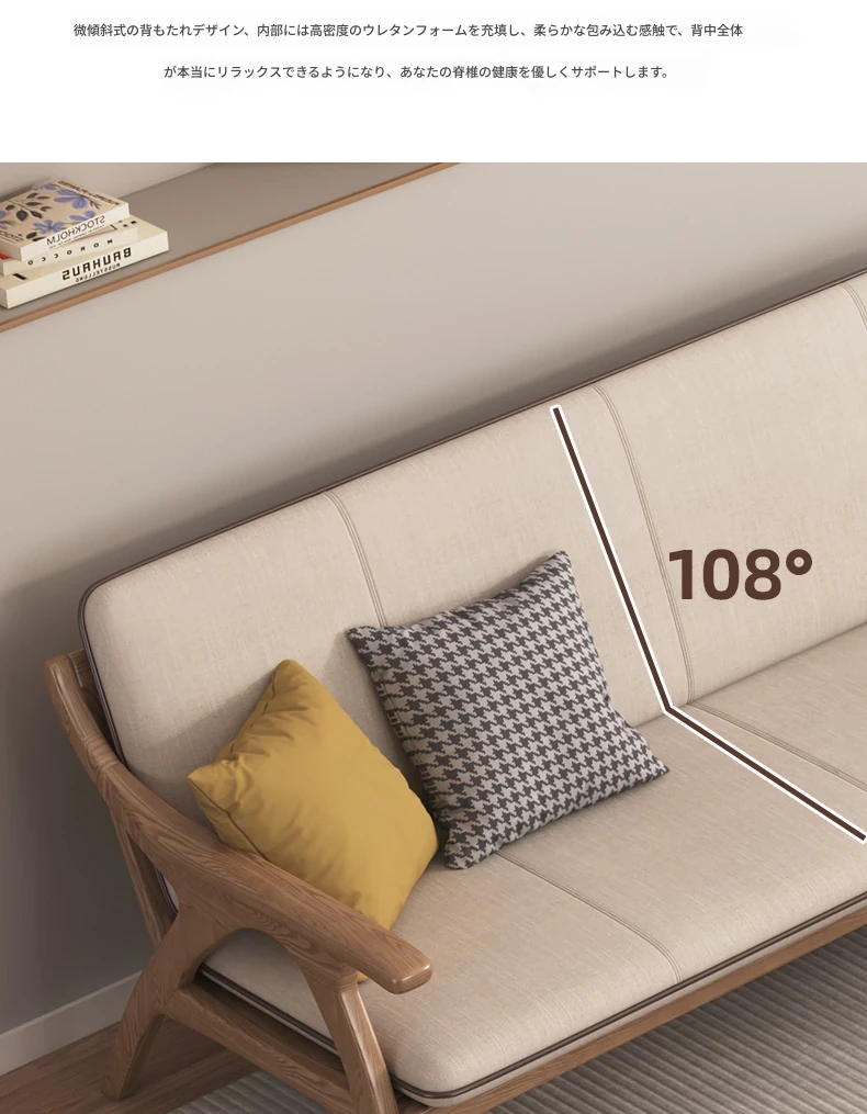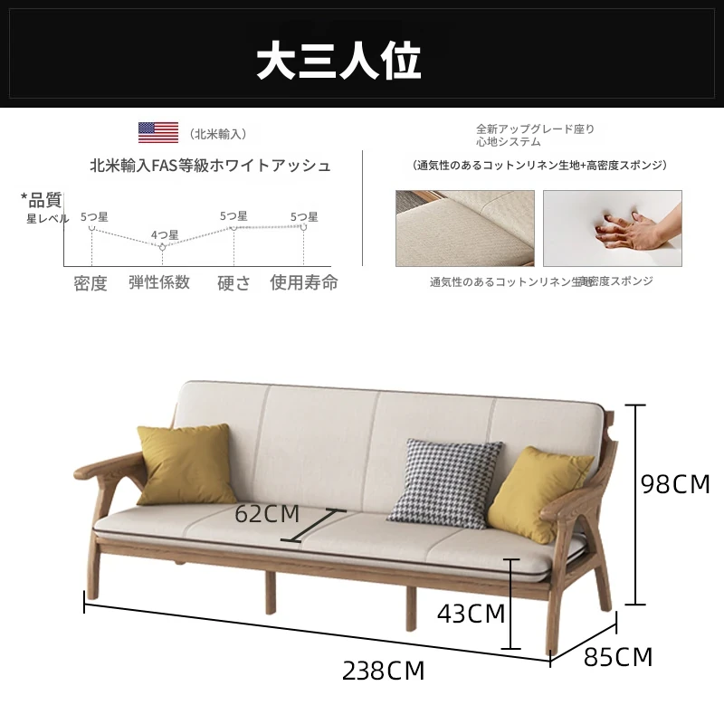 【国補専用】北欧スタイルの全白ラーチ無垢材使用、冬夏兼用のシンプルな小型3人掛けソファ。おしゃれなデザインで、お部屋を広く見せるアイテム!快適な座り心地を実現し、どんなインテリアにもぴったりです。