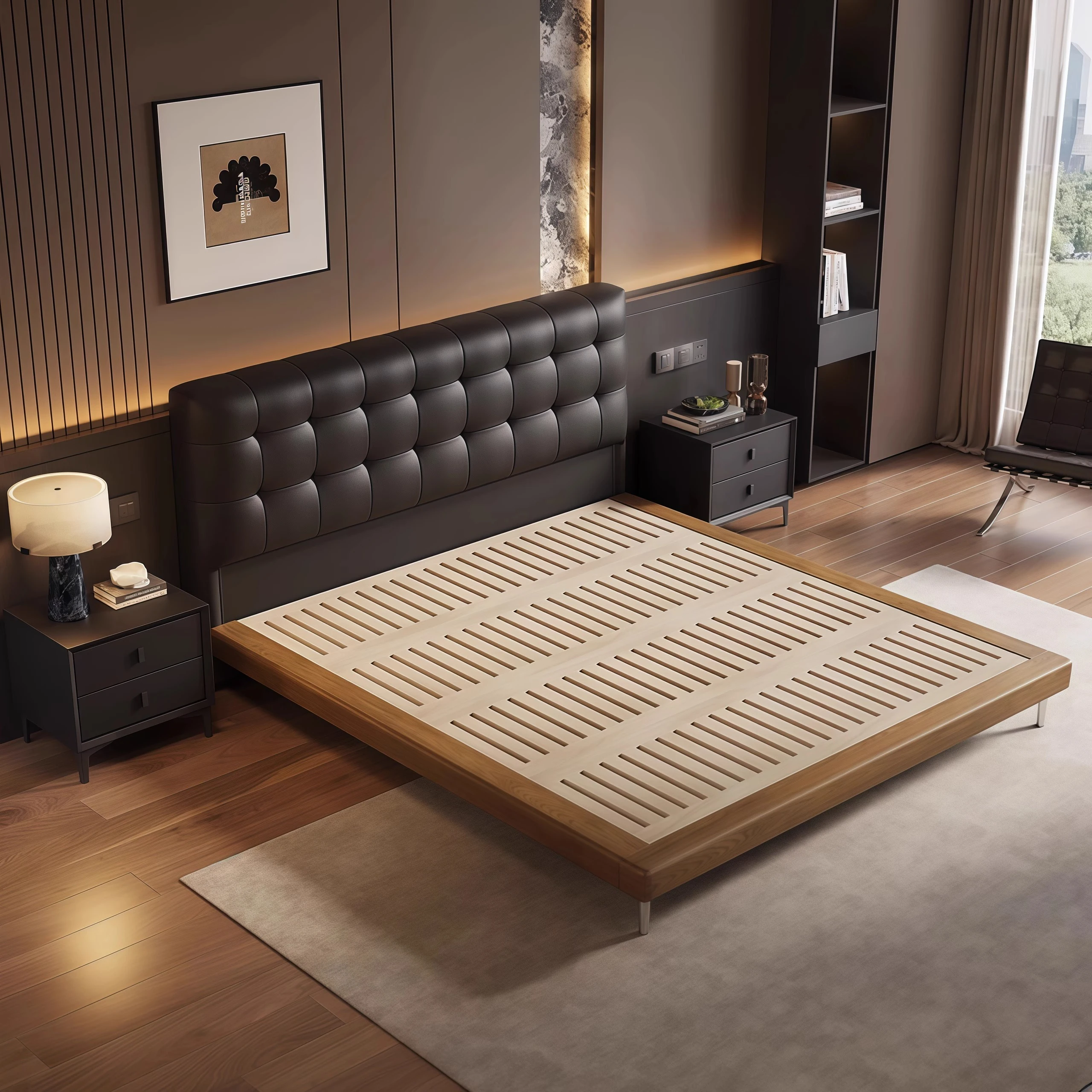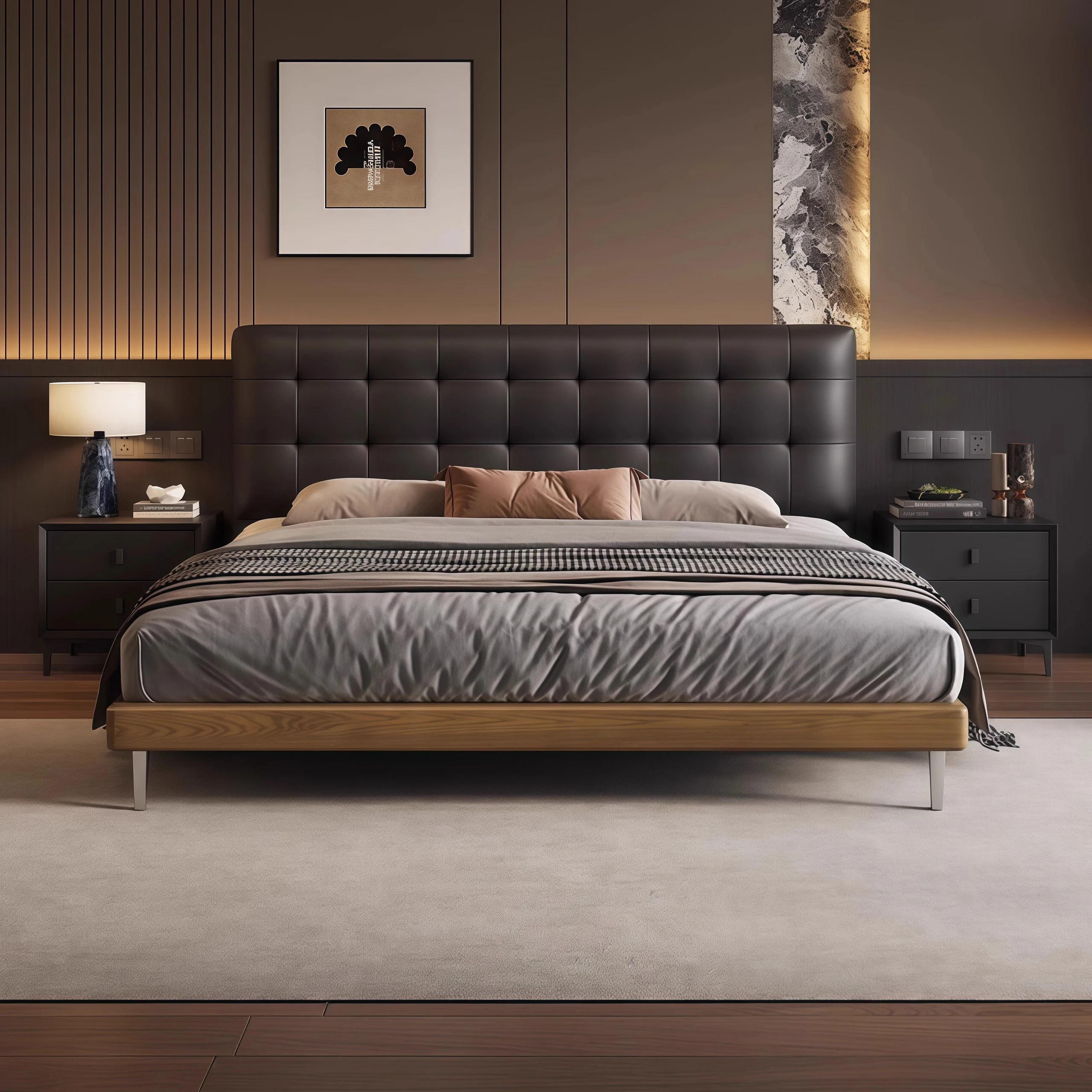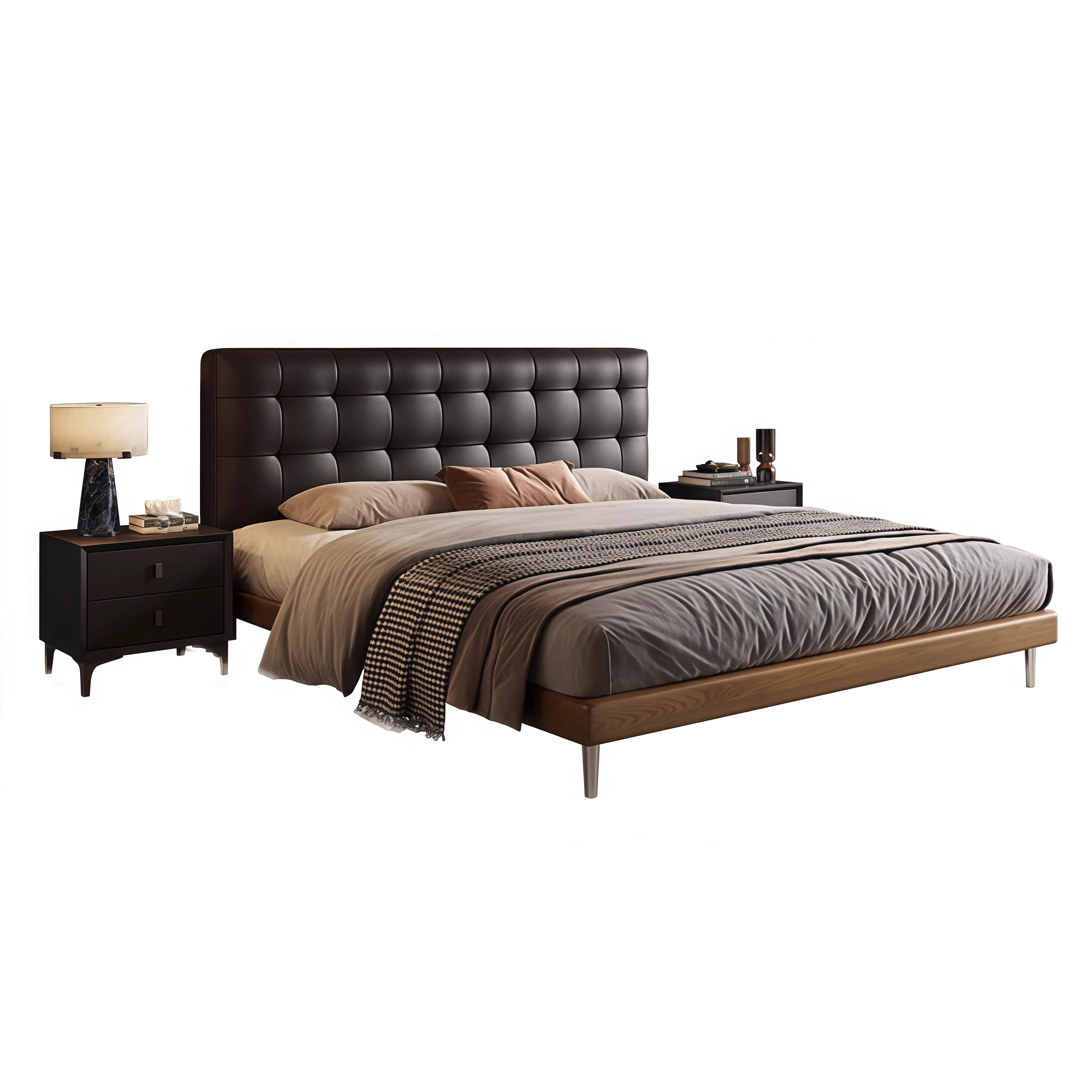 【ワッフル】本革ベッド ポプラ材のベッドフレーム + 20cm防ダニラテックスココナッツスプリングマット + 2キャビネット