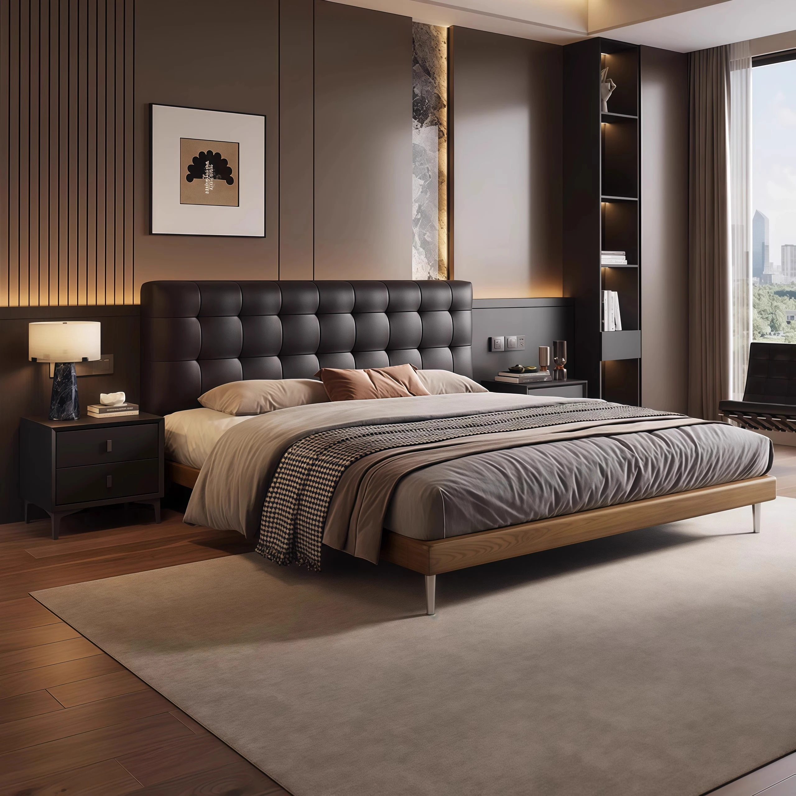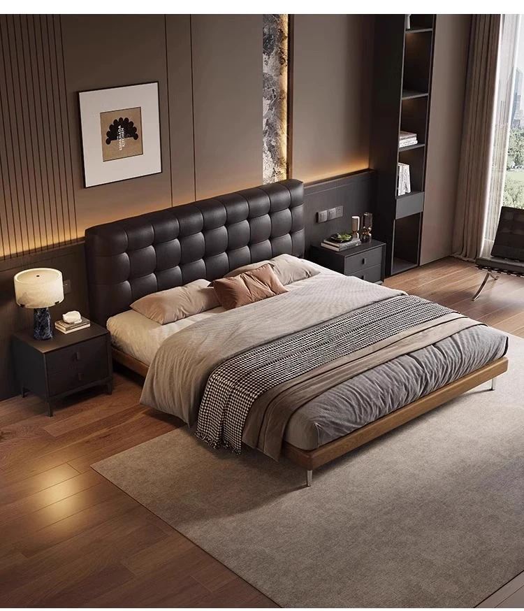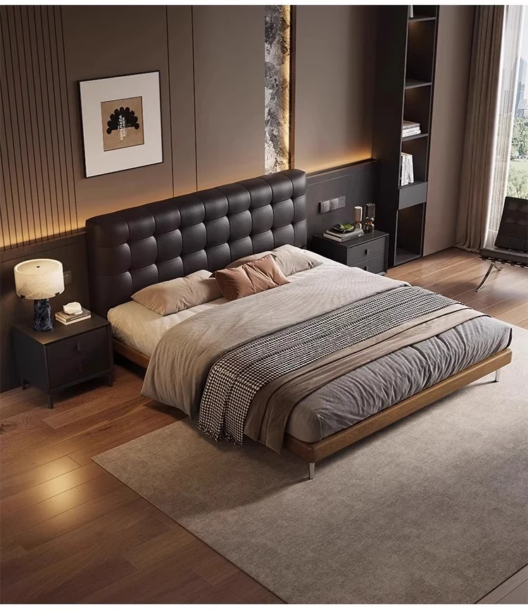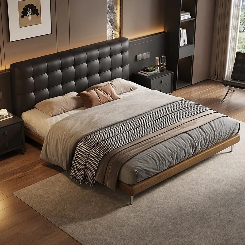 【ワッフル】本革ベッド ポプラ材のベッドフレーム + 20cm防ダニラテックスココナッツスプリングマット + 2キャビネット