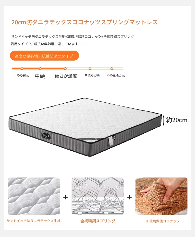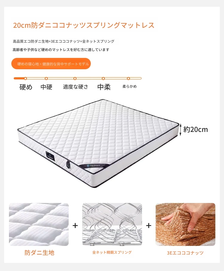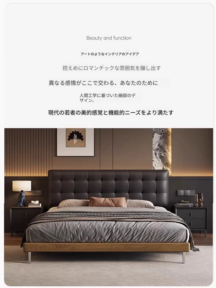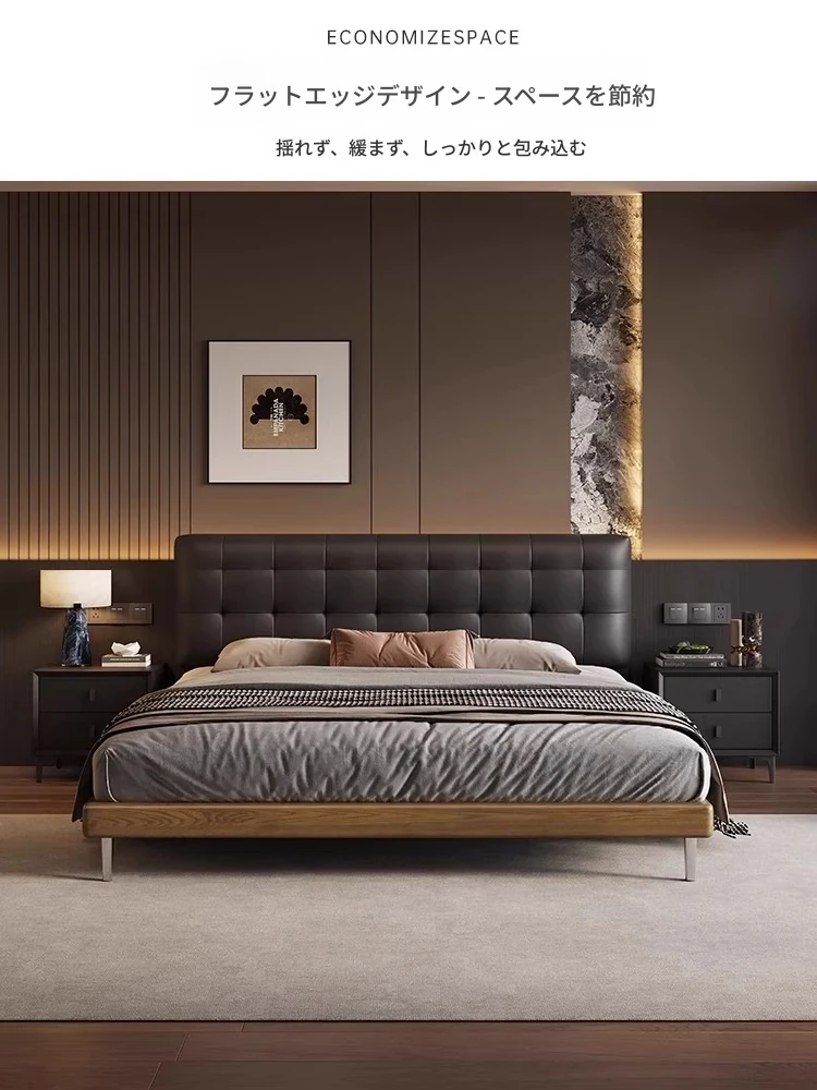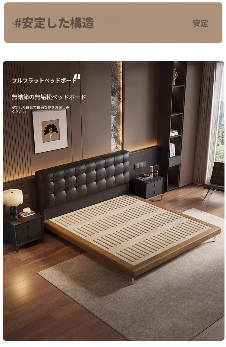 【ワッフル】本革ベッド ポプラ材のベッドフレーム + 20cm防ダニココナッツスプリングマット + 2キャビネット