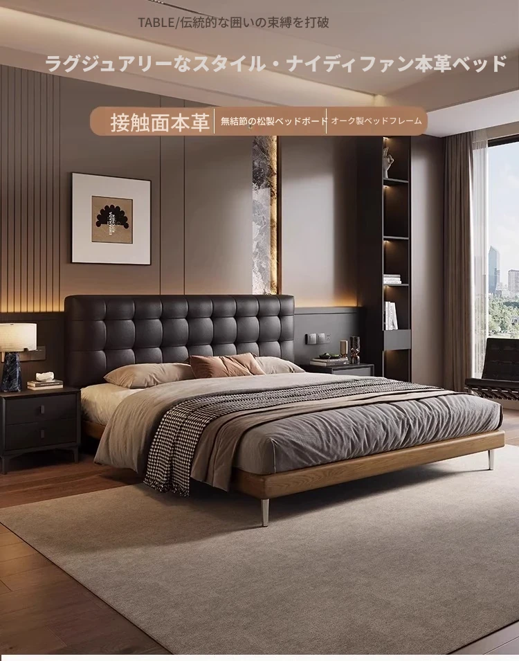 【ワッフル】本革ベッド ポプラ材のベッドフレーム + 2キャビネット