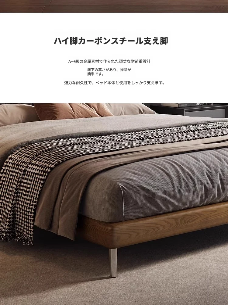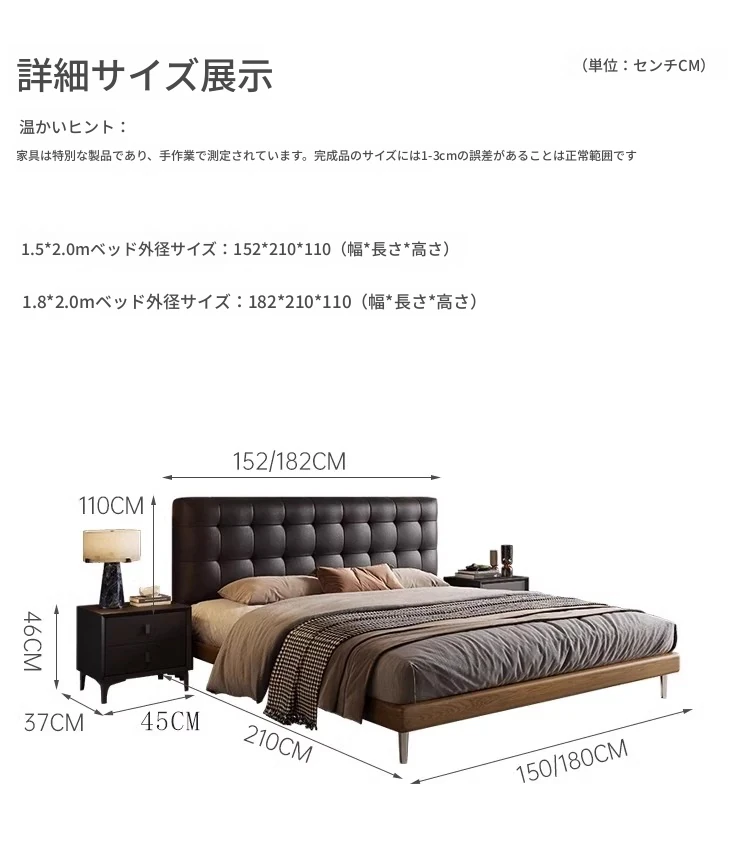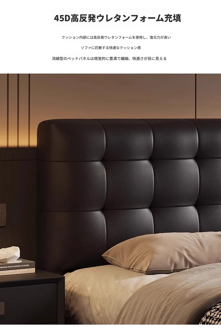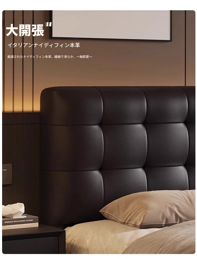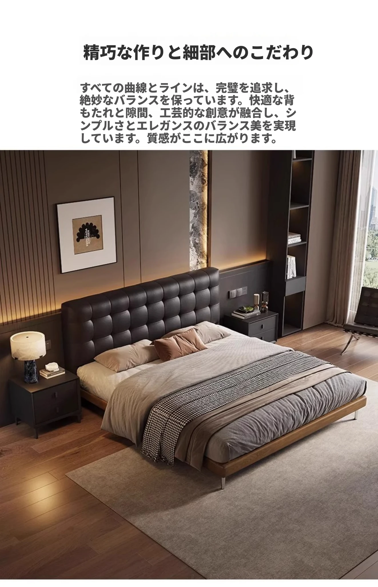 【ワッフル】本革ベッド ポプラ材のベッドフレーム + 1キャビネット
