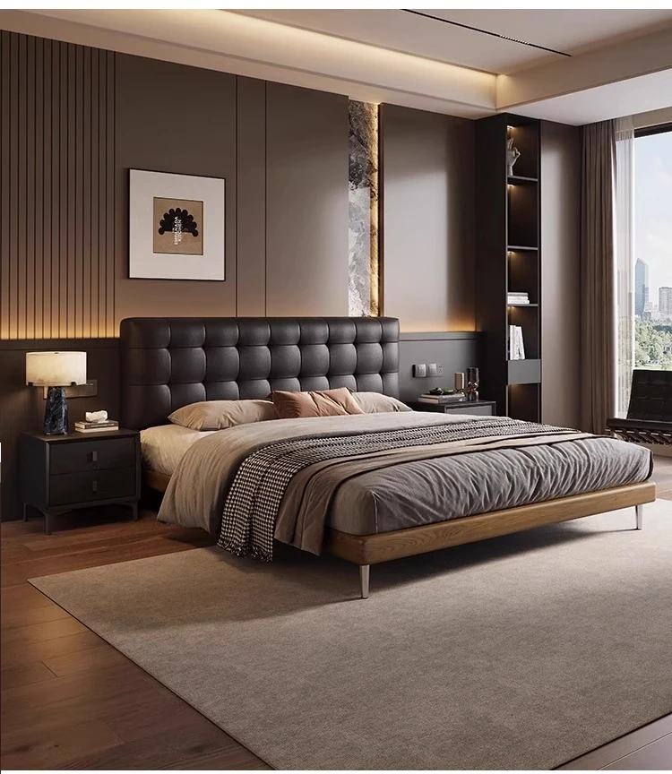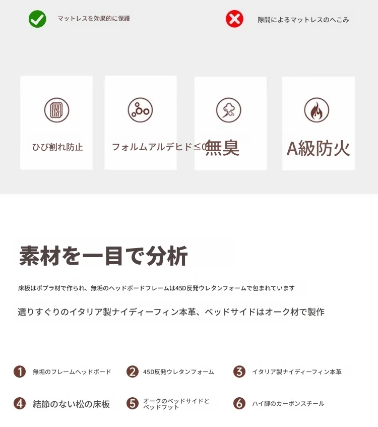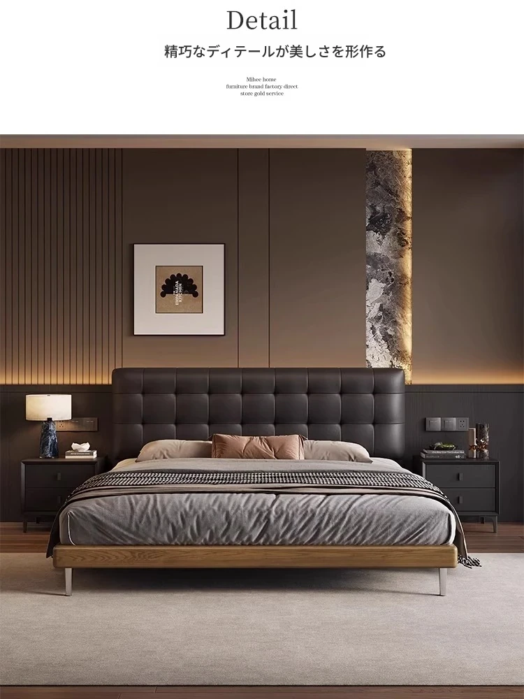 【ワッフル】本革ベッド ポプラ材のベッドフレーム + 20cm防ダニラテックスココナッツスプリングマット + 1キャビネット
