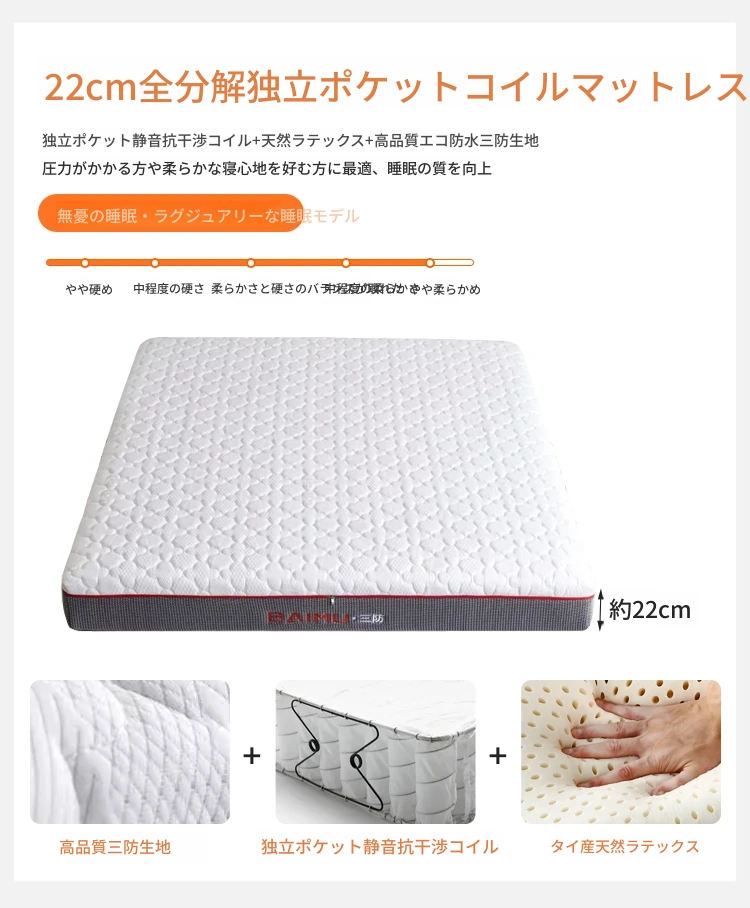 【ワッフル】本革ベッド ポプラ材のベッドフレーム + 22cm三防全取り外し可能な独立袋入りスプリングラテックスマット + 1キャビネット