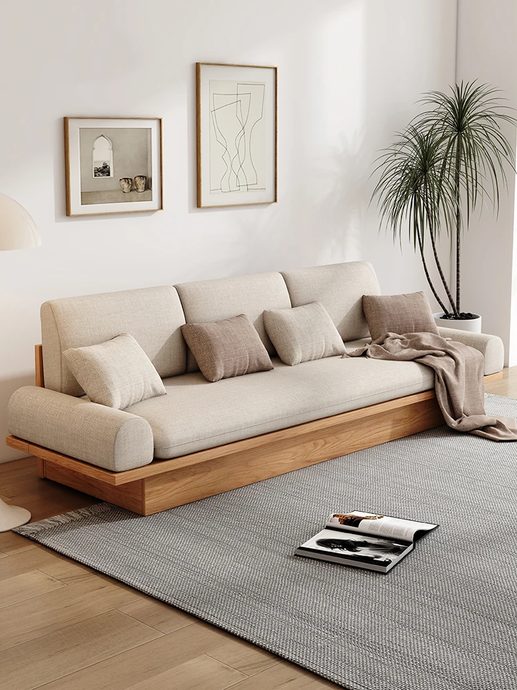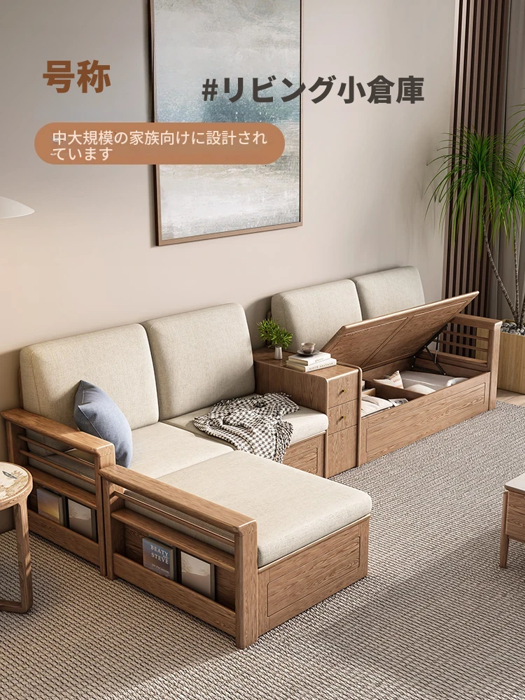 侘寂風の無垢材ソファ|モダンな3人掛け布製ソファ|和室にもぴったりな収納機能付き|おしゃれなリビングを演出する日本式デザイン