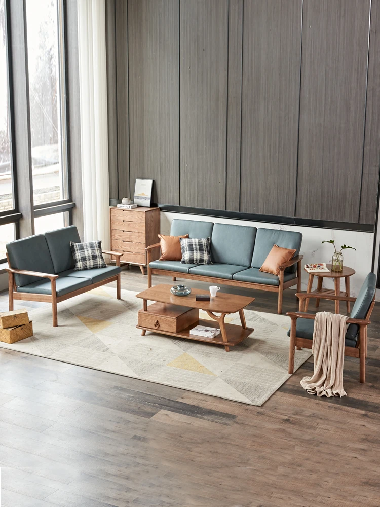 現代的シンプルで新しい中式リビング家具、小型住宅向け、洗えるテクノロジー布製、ウォールナット色の全実木ソファ。快適さとスタイルを兼ね備えた、あなたのリビングに最適な選択!