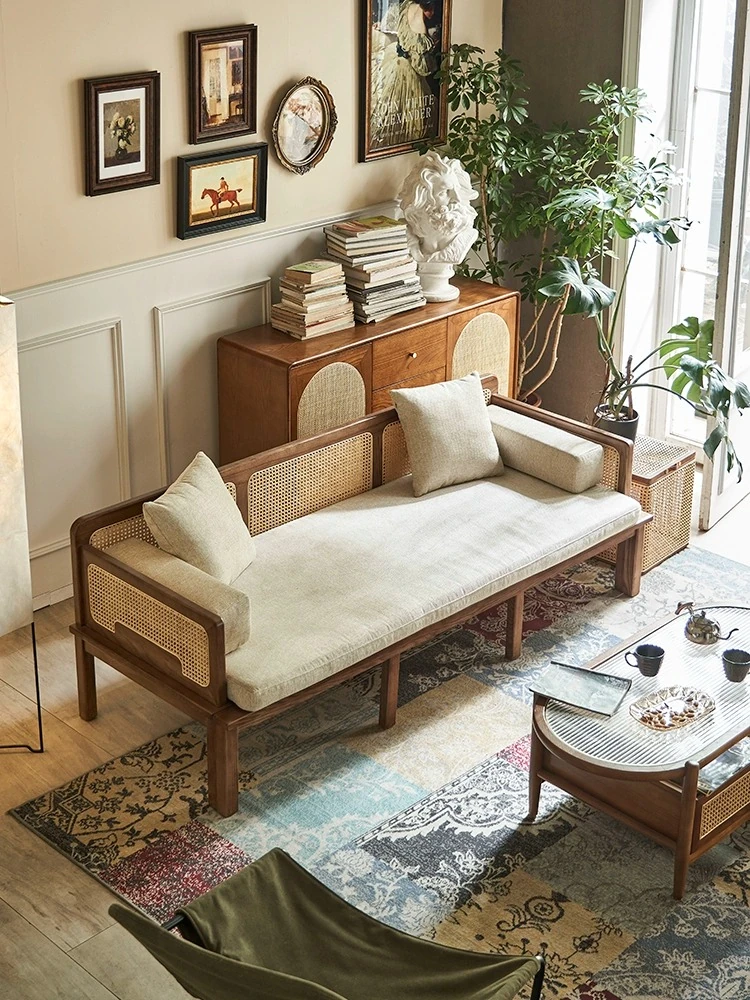 レトロな無垢材ソファベッド - リビングルームに最適な伸縮式ロハンベッド!ホワイトアッシュの折りたたみ式で、快適な睡眠とおしゃれなインテリアを両立。ラタン編みのデザインで、温かみのある雰囲気を演出。