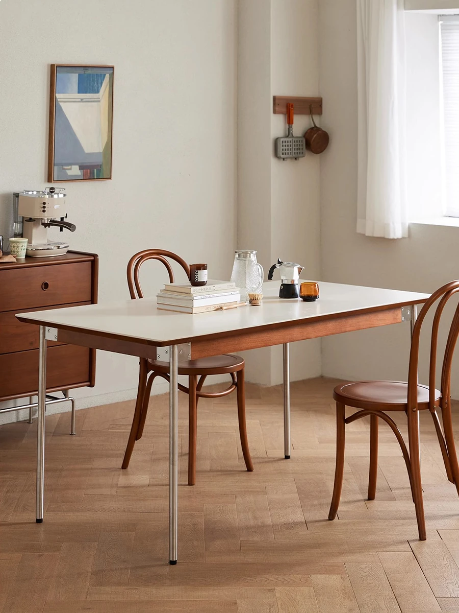 中古のホワイト岩板ダイニングテーブル - 北欧ヴィンテージスタイルの無垢材使用!小さなスペースにもぴったりな長方形デザイン。おしゃれで機能的な原木家具で、心地よい食卓を演出します。