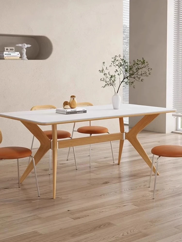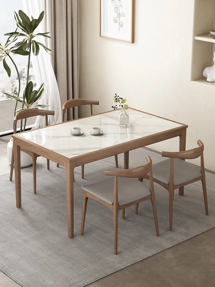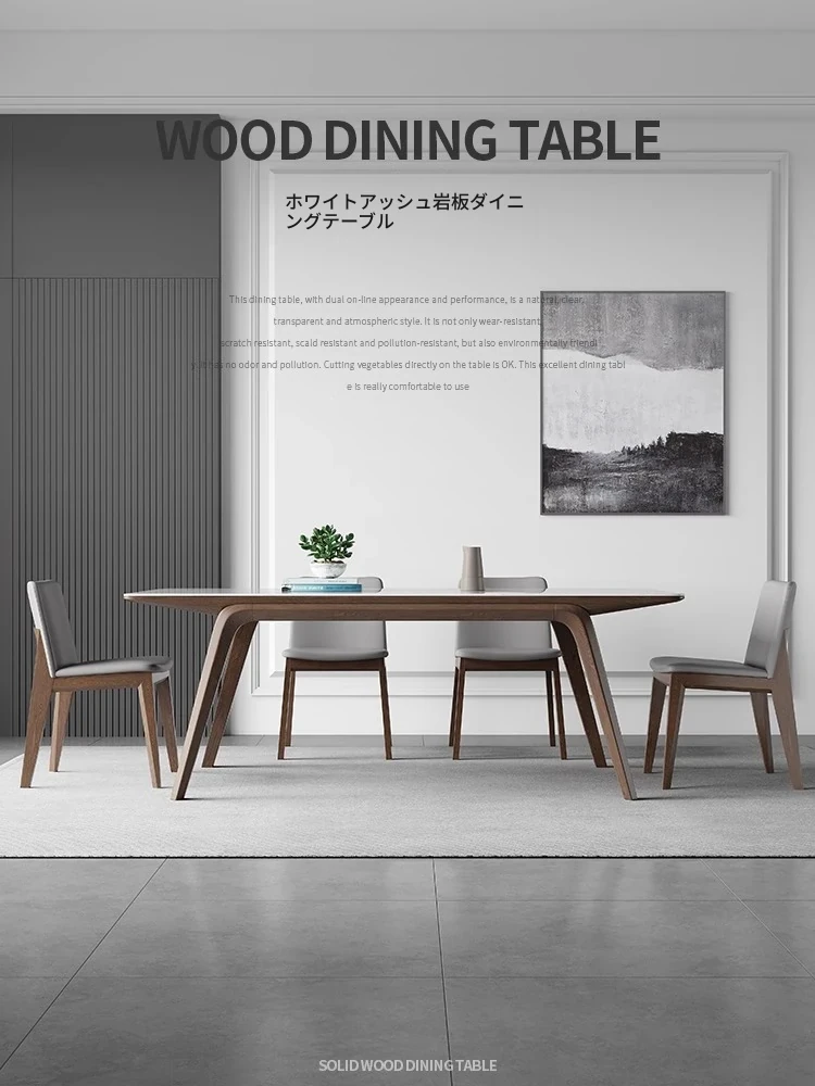 モダンミニマルデザインのアメリカンアッシュ無垢材ダイニングテーブル - 光沢のあるホワイトストーンプレート仕上げ、家族の集いに最適な長方形テーブル!